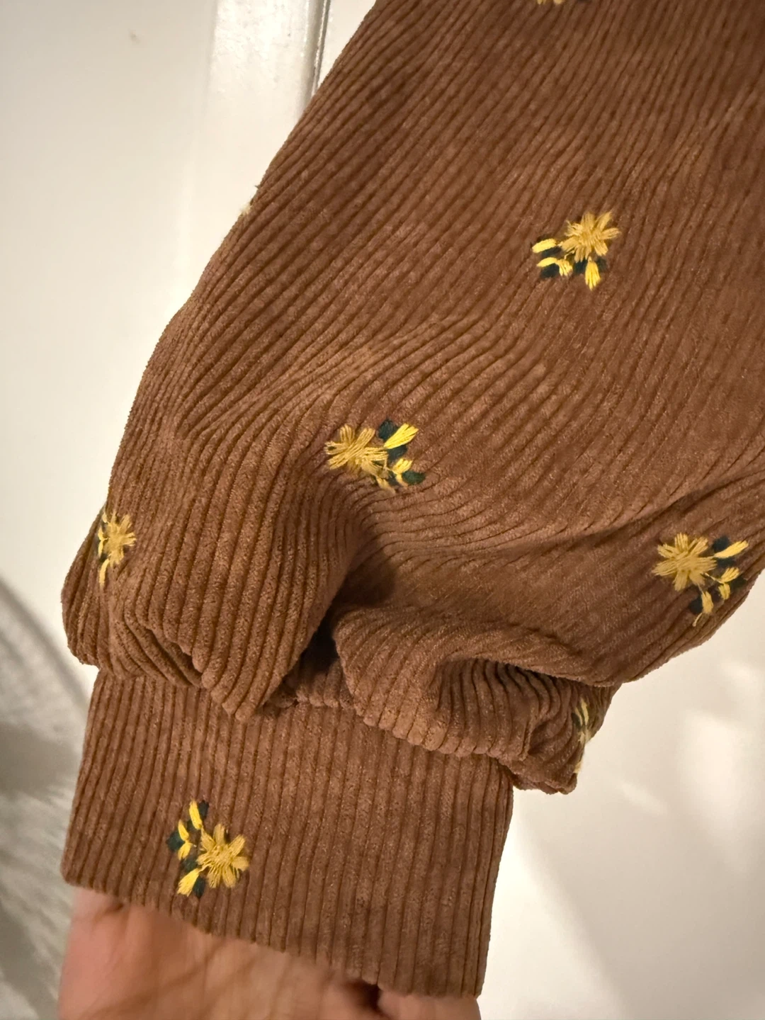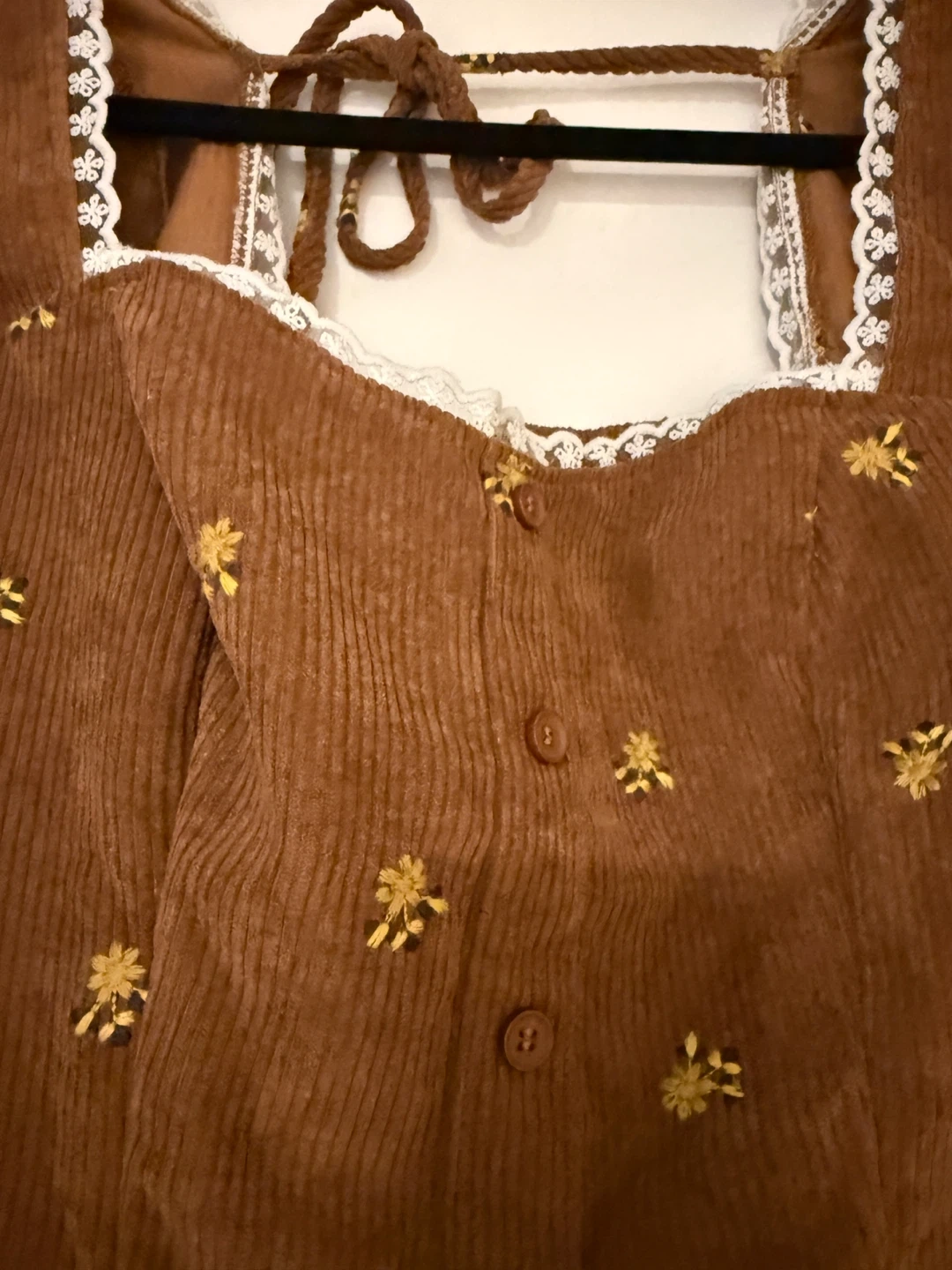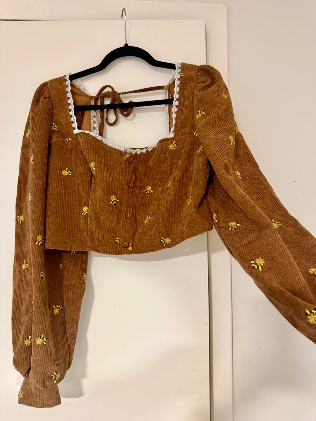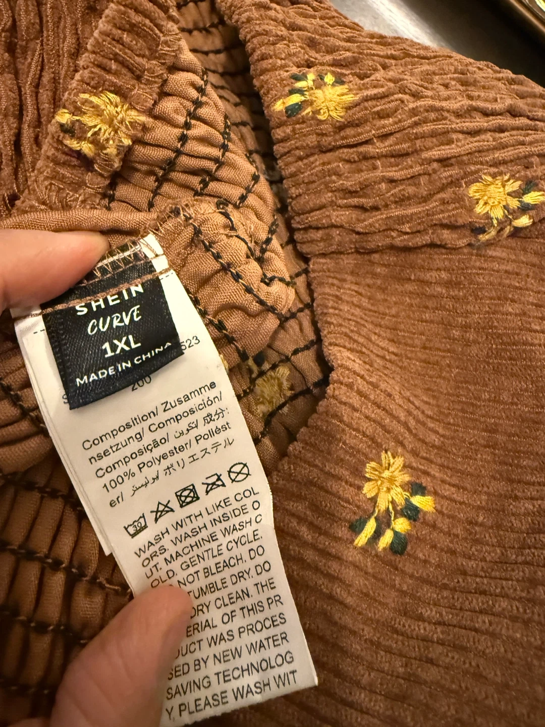 Selling a Shein Curve top in size 1XL! It's a beautiful brown corduroy material with cute floral embroidery. Perfect for adding a touch of vintage charm to your wardrobe