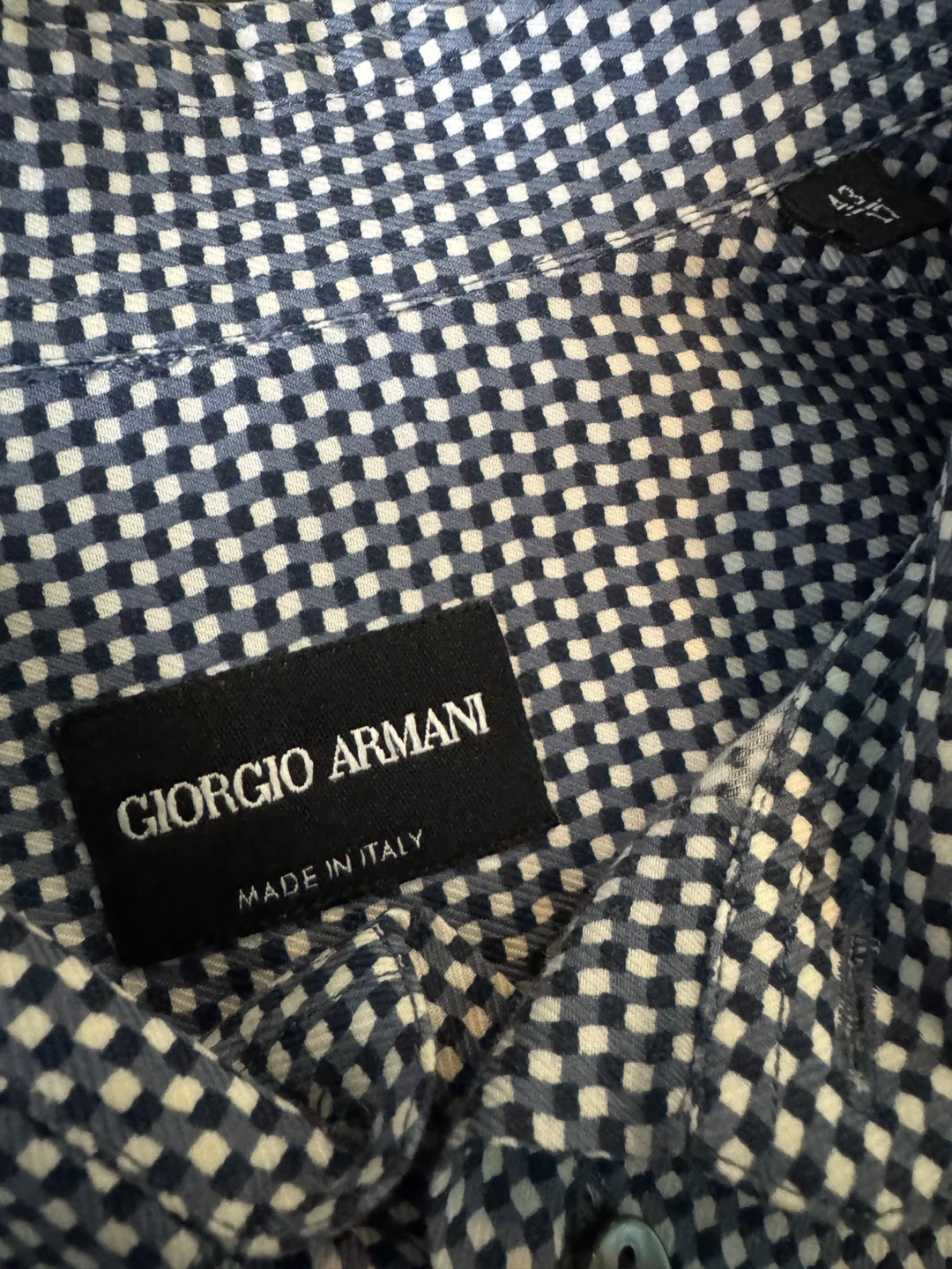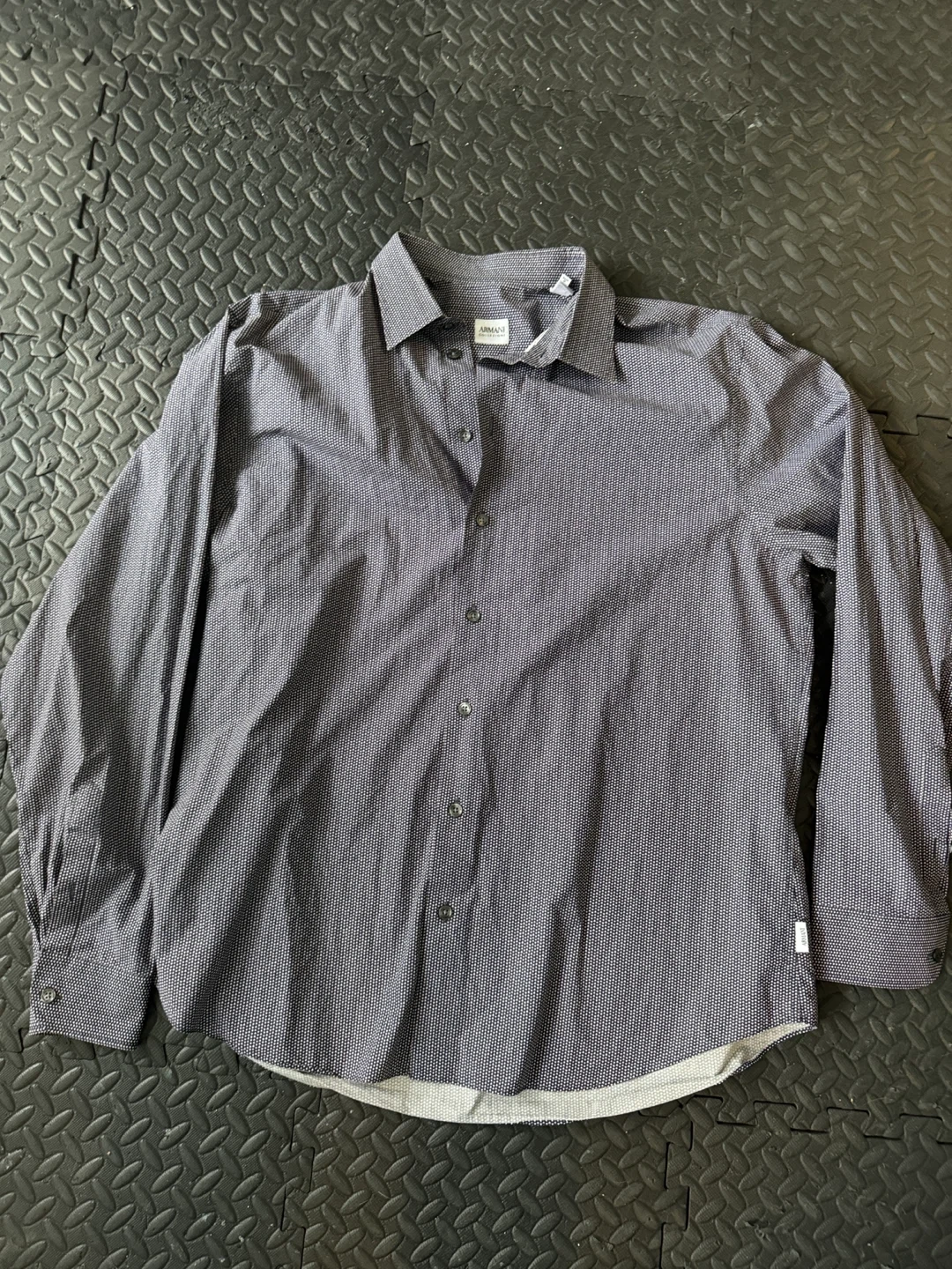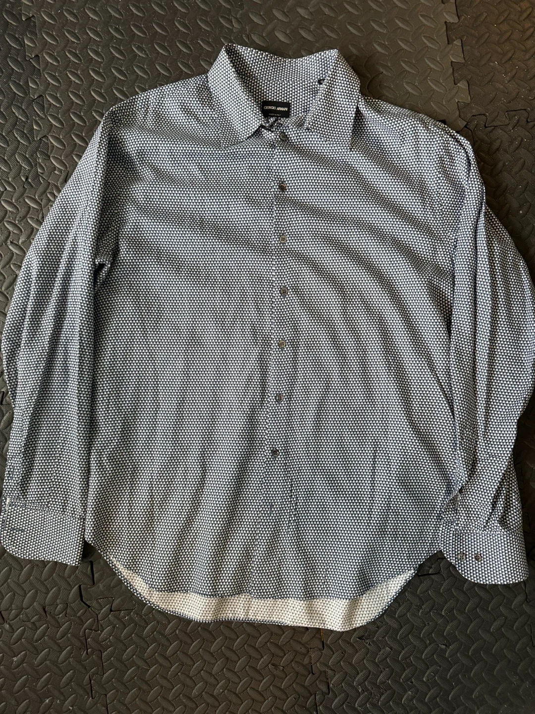 Selling an Armani long sleeve button-up shirt in size 39/15.5. The shirt features a stylish pattern and is made in Italy. It's in great condition and ready for a new wardrobe!