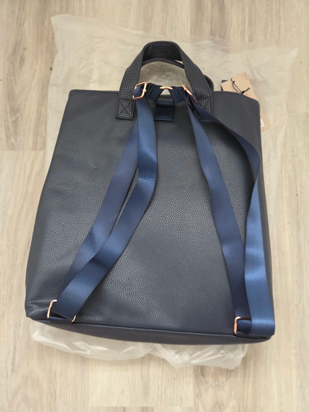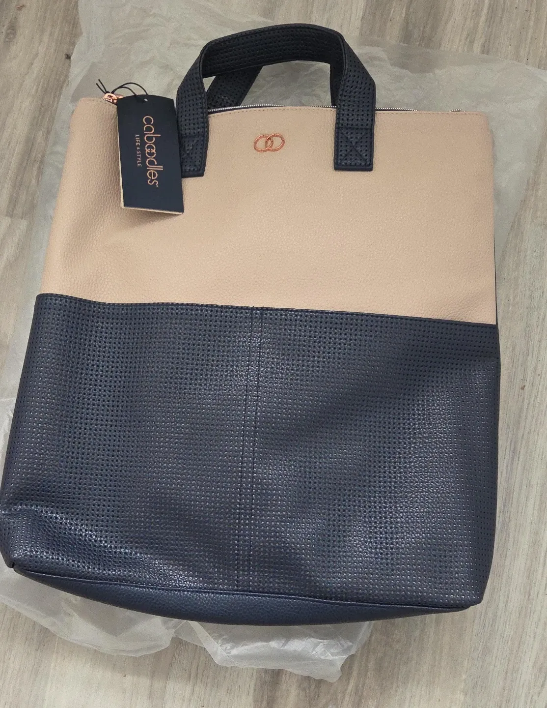 I'm selling a brand new Caboodles tote bag with tags still attached! It features a stylish two-tone design in beige and navy. Perfect for carrying your essentials in style!