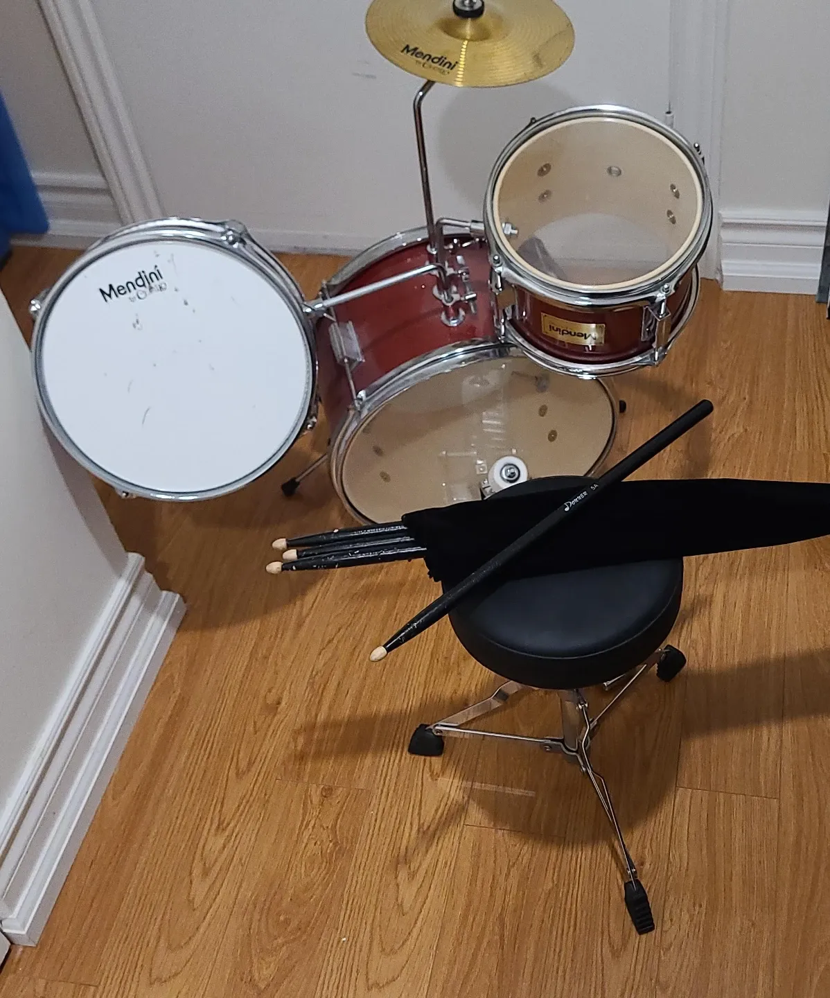 Selling a Mendini kids drum set. It comes with the stool and drum sticks. Great for kids who are starting to learn drums!