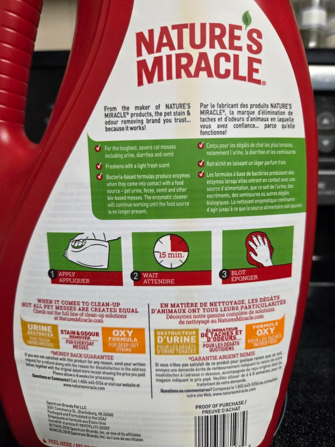 Selling 3 large jugs of Nature's Miracle Advanced Stain & Odour Eliminator. $30 each. This is a severe mess enzymatic formula, perfect for tough pet odours and stains. It's a 3.78 L bottle and works on carpets, floors, furniture, and more. It's also safe for pets and home
