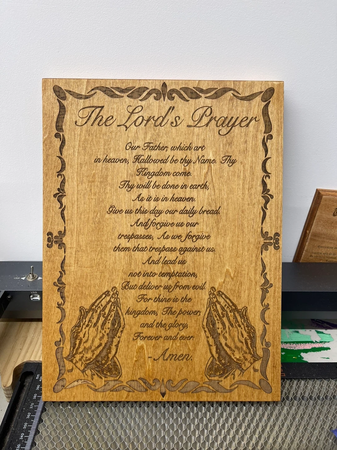 Send a design, size/dimension of the item you would like (example, 5”x7” or 8.5”x11”, etc), name or message and I can laser engrave it for you.