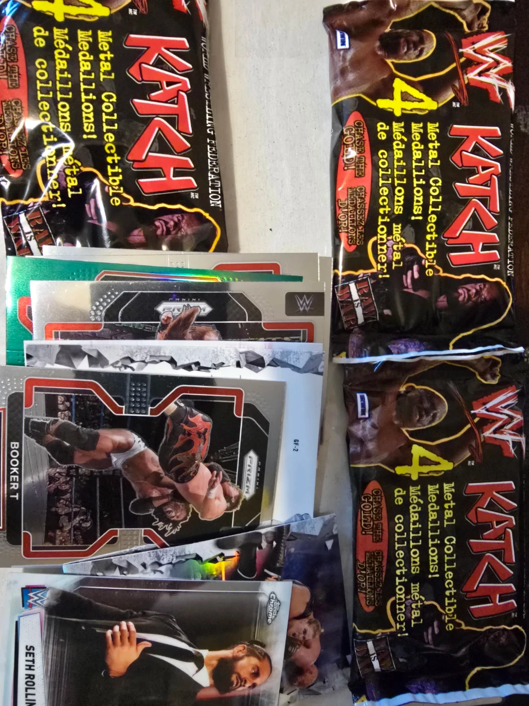 Selling a mix of WWE Katch metal collectible medallions and trading cards! Includes cards featuring Booker T and Seth Rollins. Perfect for any wrestling fan or collector