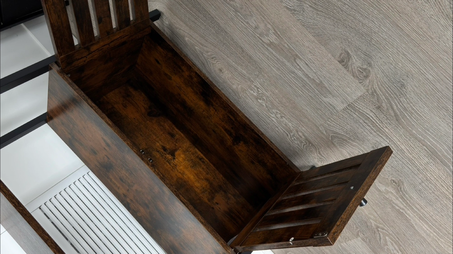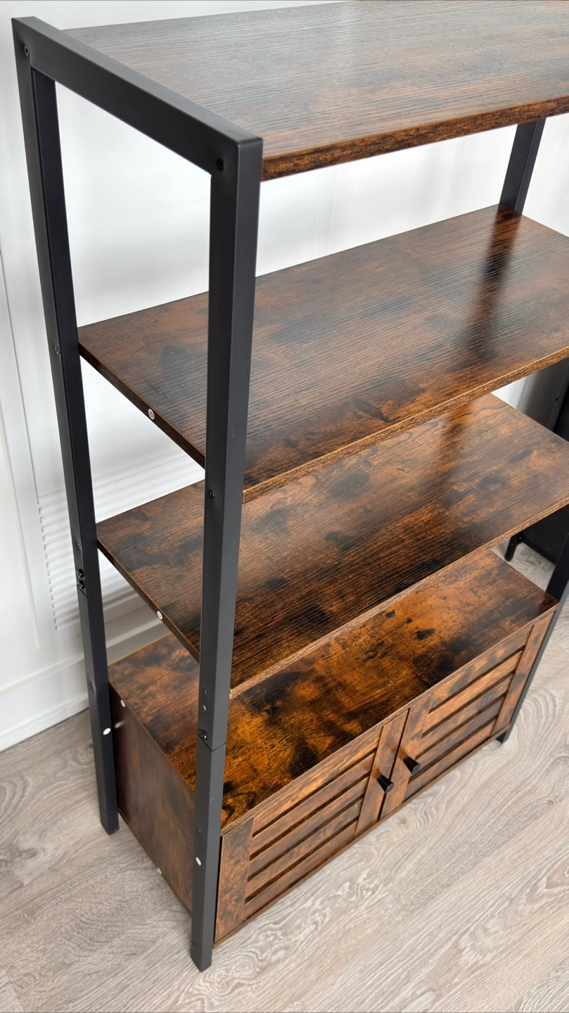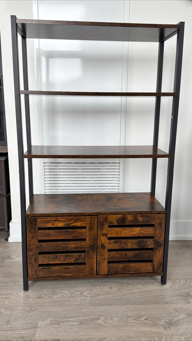 This ladder shelf is perfect for adding some stylish storage to any room! It features four shelves and a cabinet at the bottom for concealed storage. The dark brown wood finish and black metal frame give it a modern, industrial look. It's in great condition and ready for a new home