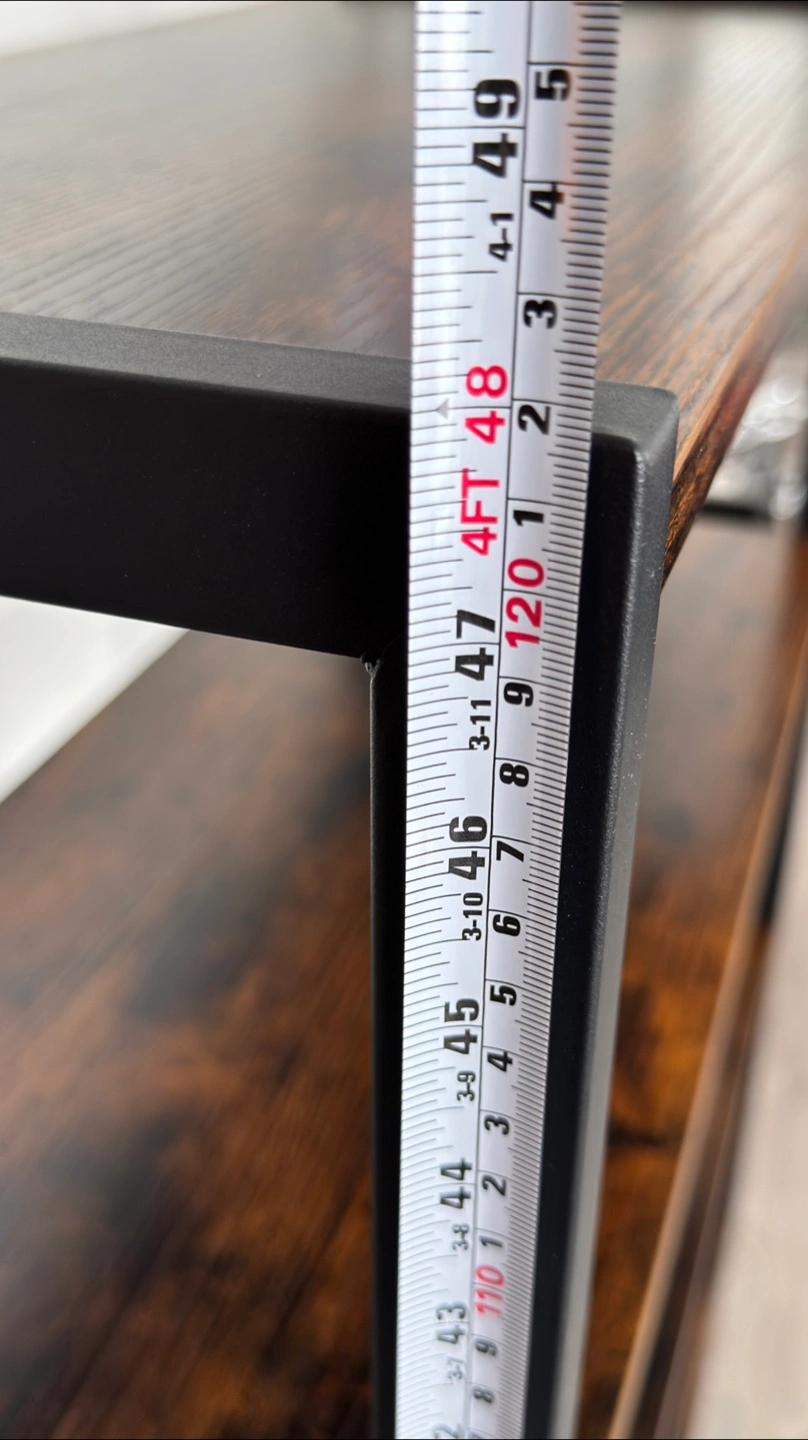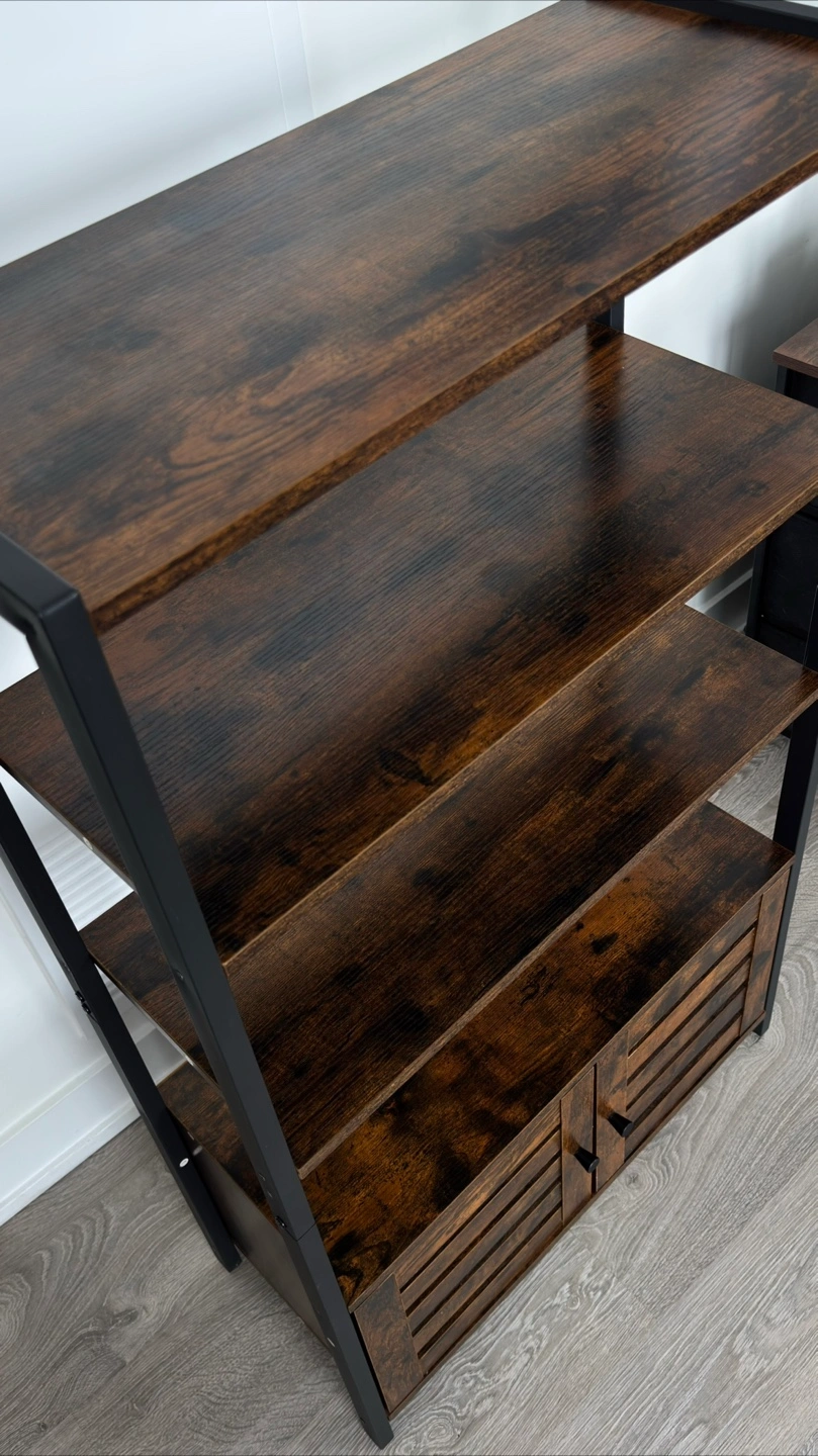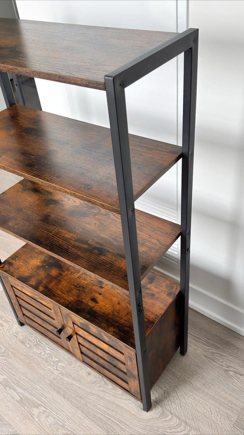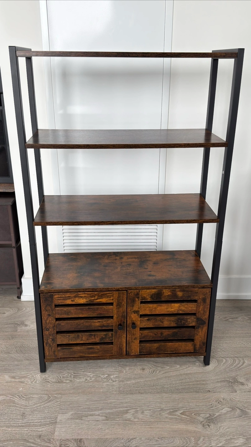 This ladder shelf is perfect for adding some stylish storage to any room! It features four shelves and a cabinet at the bottom for concealed storage. The dark brown wood finish and black metal frame give it a modern, industrial look. It's in great condition and ready for a new home