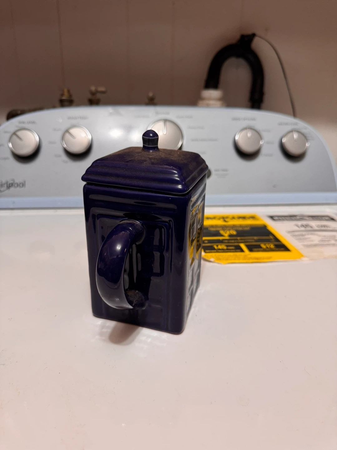Selling a Doctor Who Tardis mug with a lid. It's in good condition and ready for a new home. Perfect for any Doctor Who fan!