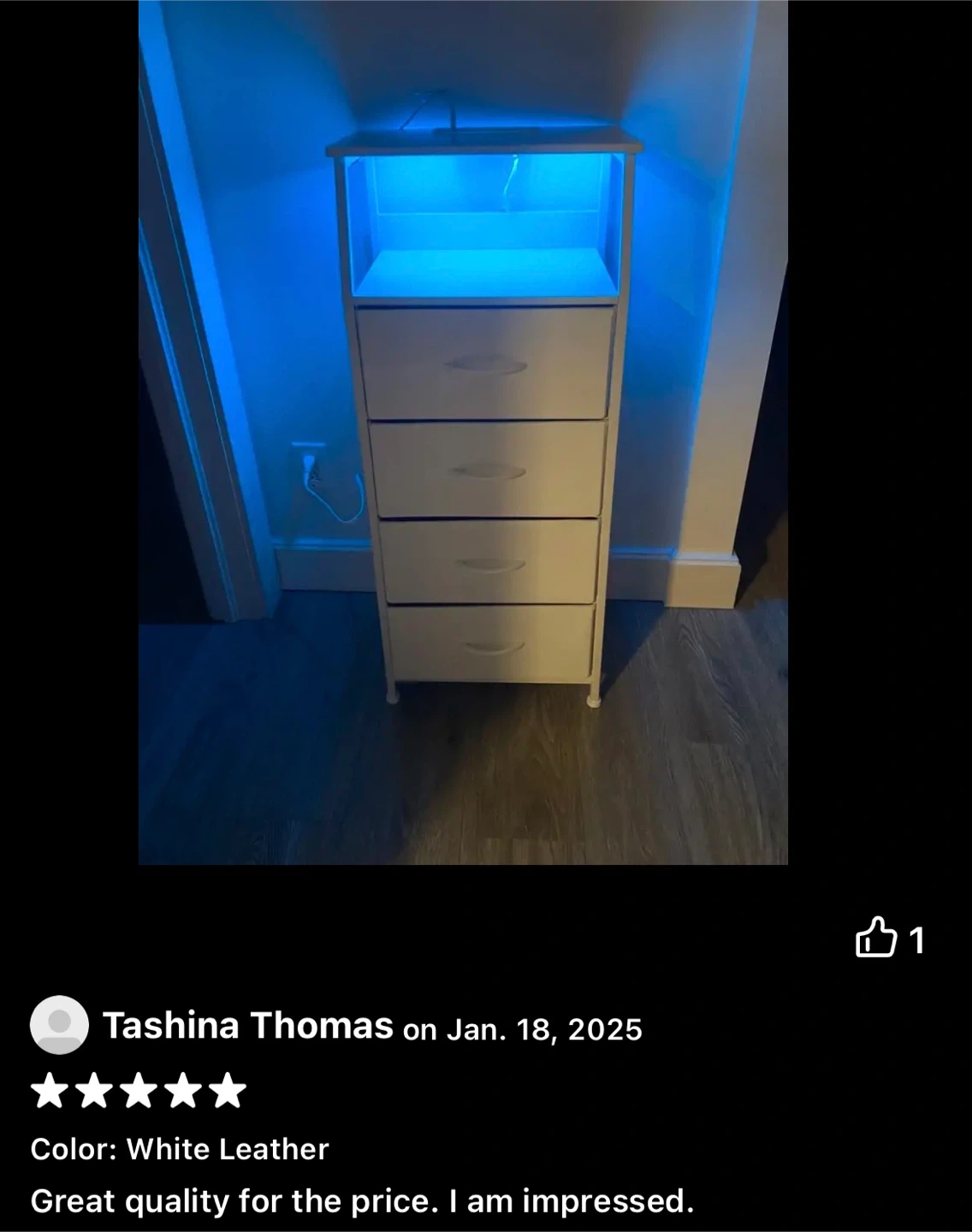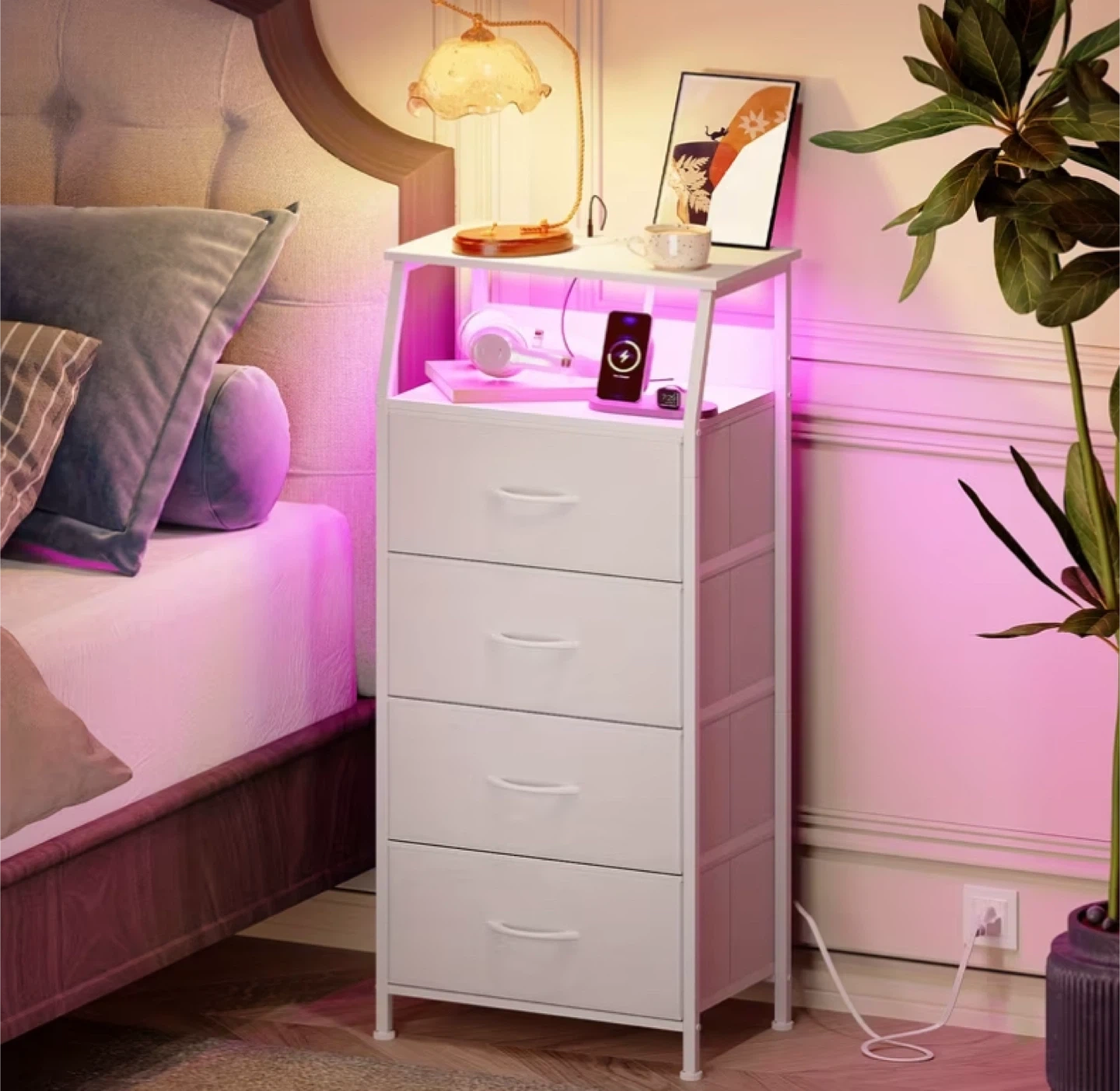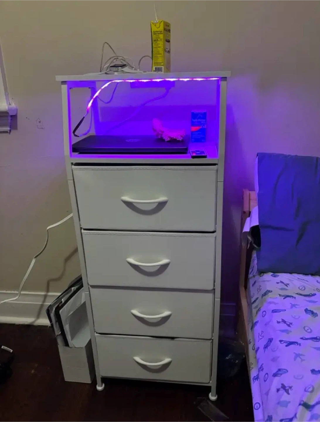 Selling a BRAND NEW white 5-drawer dresser, perfect for adding some extra storage to your bedroom or living space! It features a built-in LED light strip with 20 colours and 19 dynamic modes, all controllable with a remote. There are also 10 speed modes and 5 brightness modes. Also includes 2 AC outlets (120V/12A), 2 USB ports (5V/3A), and a 6.5-foot power cord, so you can charge your devices right on the dresser. The box is included!