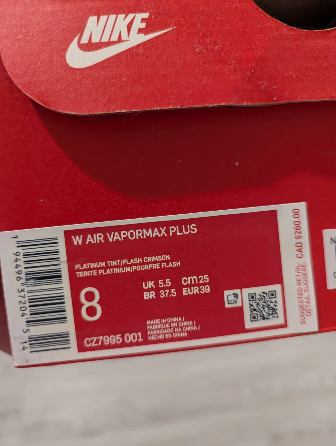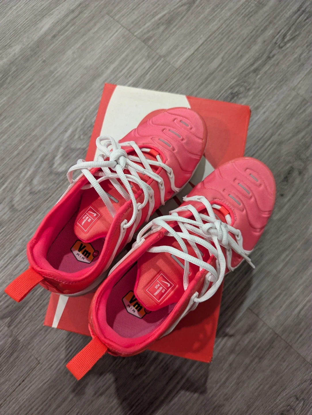 Selling a pair of Nike Air VaporMax Plus in a vibrant platinum tint/flash crimson colour! These shoes are a women's size 8 and come with the original box. They're in great shape and ready for a new owner