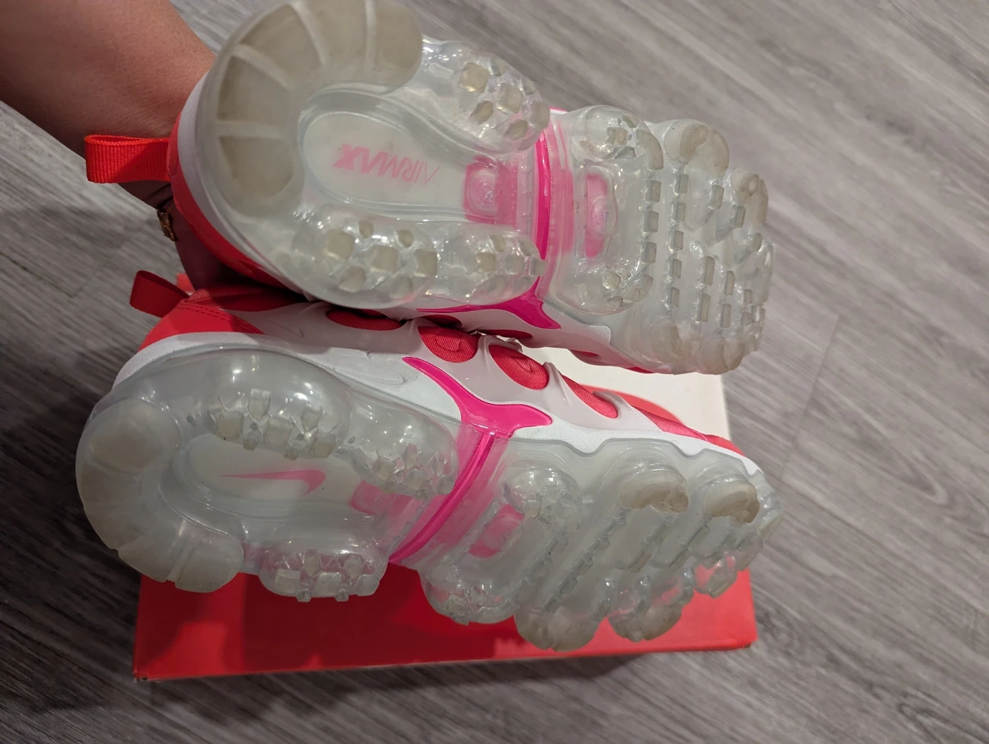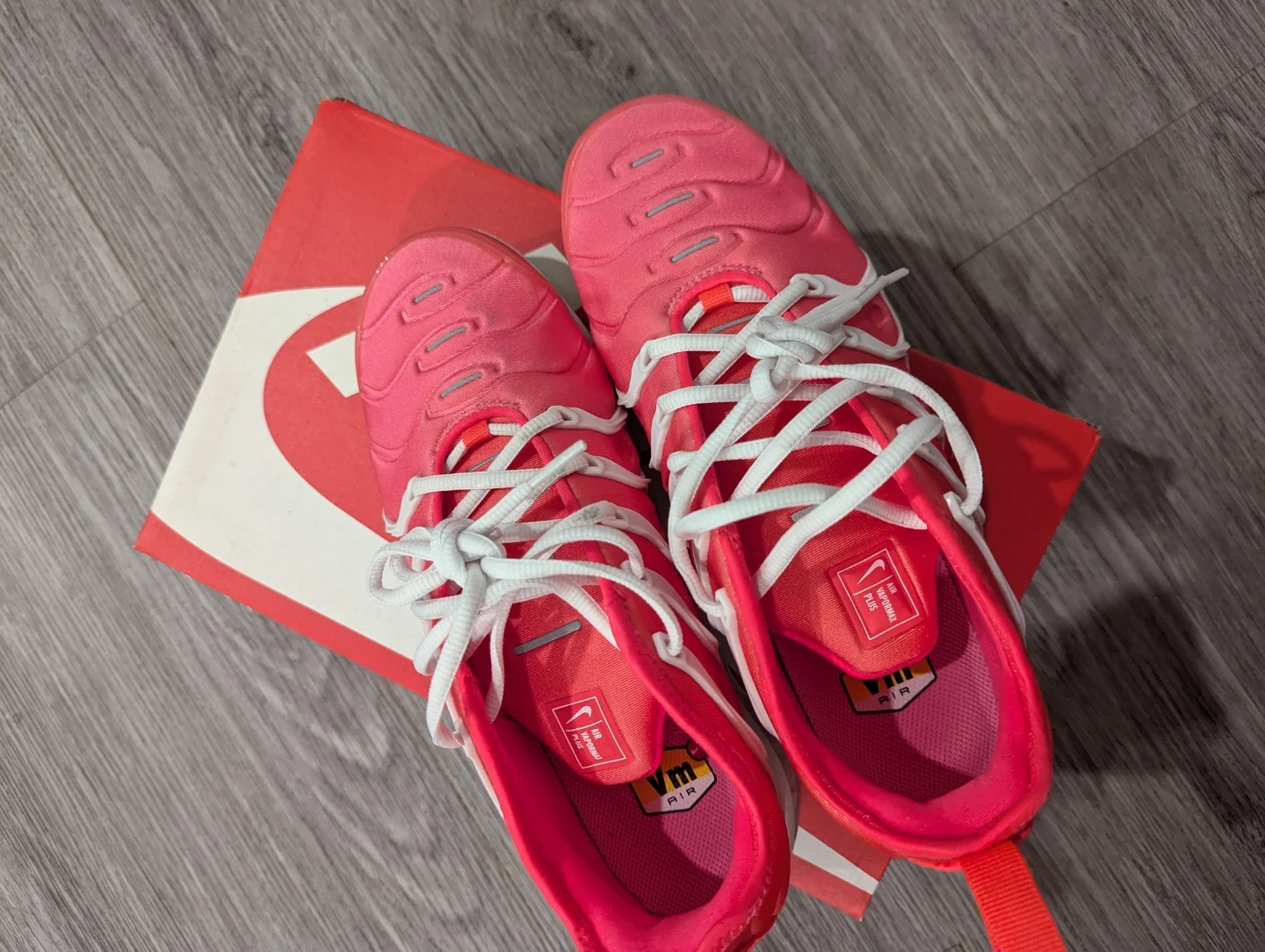 Selling a pair of Nike Air VaporMax Plus in a vibrant platinum tint/flash crimson colour! These shoes are a women's size 8 and come with the original box. They're in great shape and ready for a new owner