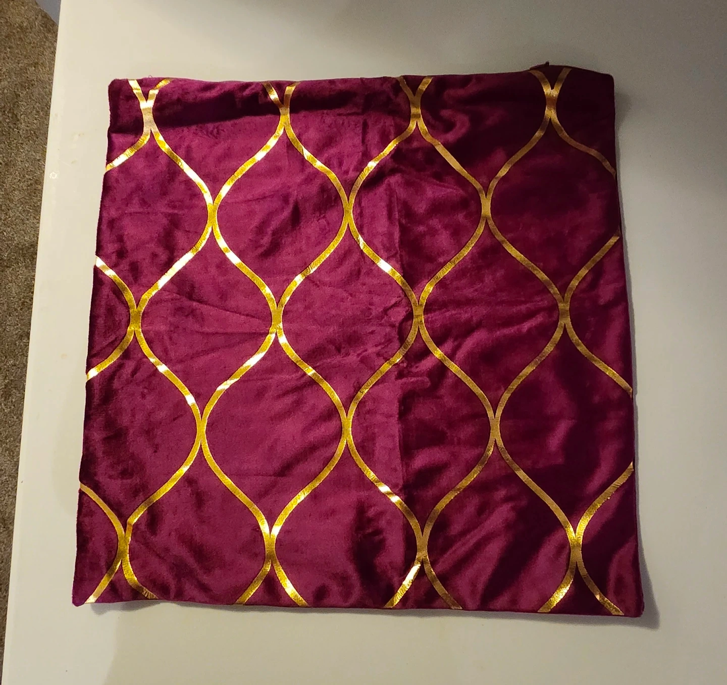 Add a touch of elegance to your home with these beautiful burgundy pillow covers featuring a gold pattern! It's perfect for adding a pop of colour and style to any room. The cover is in great condition and ready to brighten up your space