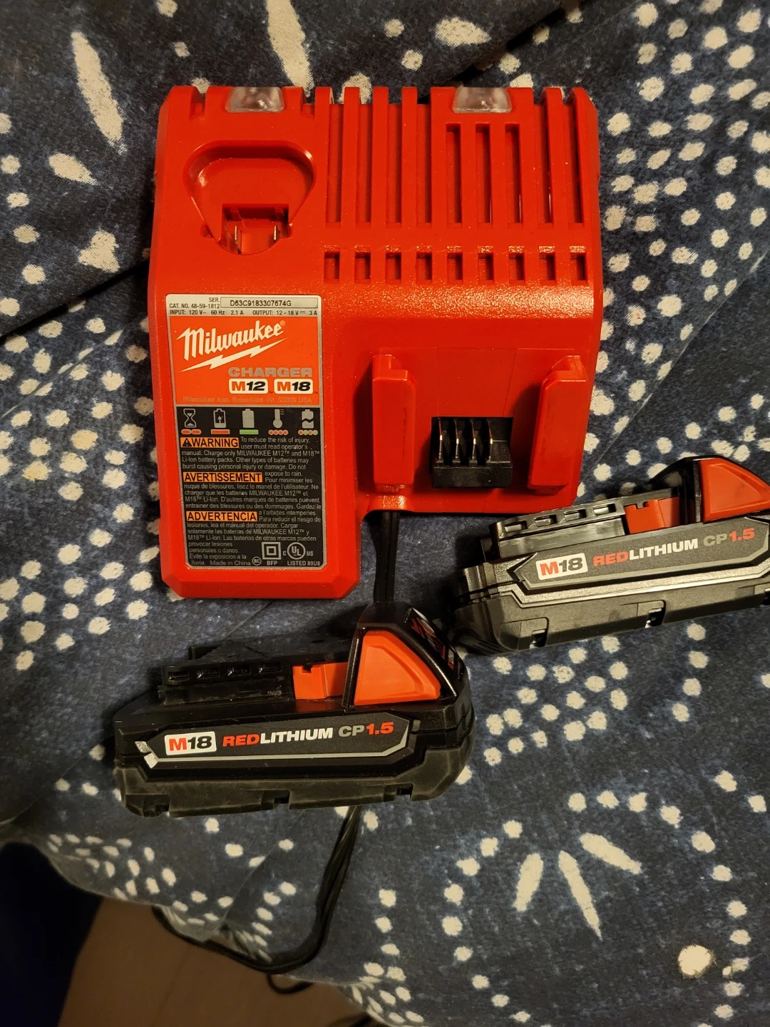 Selling a Milwaukee M12 and M18 battery charger along with two M18 REDLITHIUM CP1.5 batteries
