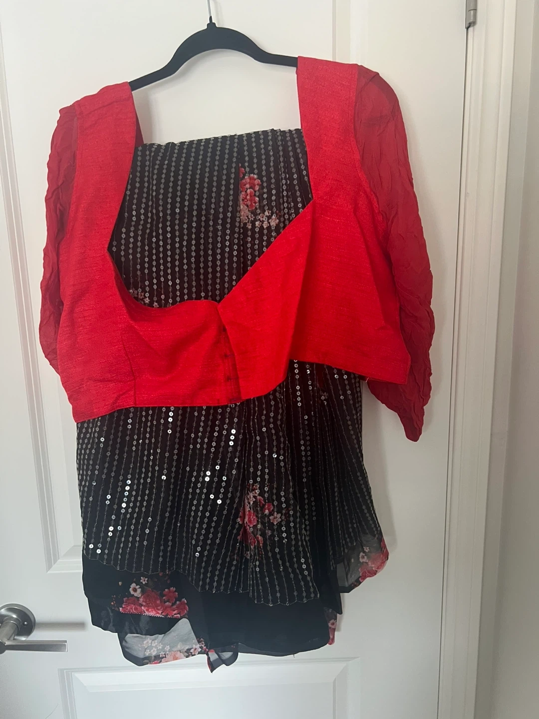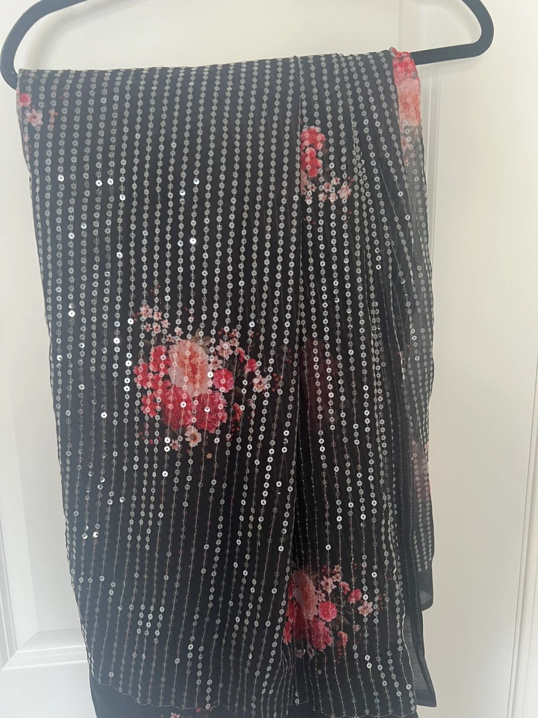 Beautiful saree featuring a striking black base adorned with delicate floral patterns and shimmering sequins. The set includes a coordinating red blouse to complete the look. Perfect for special occasions or adding a touch of elegance to your wardrobe