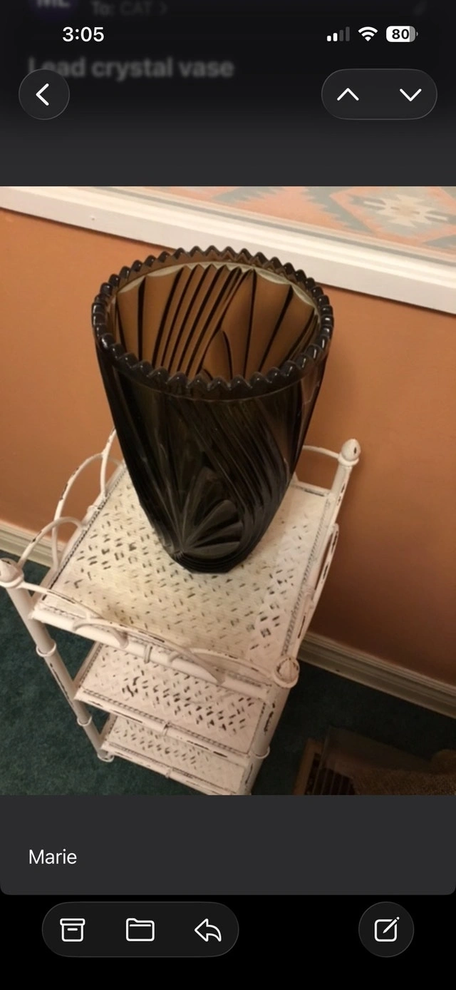 This is a pre-owned lead crystal vase featuring a smoky colour and solid weight, with a circumference of 20 1/2 inches and a height of 11.5 inches; it's in excellent condition, perfect for displaying your favourite floral arrangement or as a decorative centrepiece. This vase has been well cared for, making it a timeless addition to any home. If the ad is up, yes, it's still available!