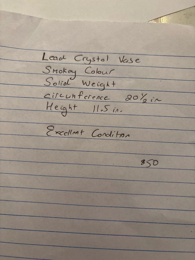 This is a pre-owned lead crystal vase featuring a smoky colour and solid weight, with a circumference of 20 1/2 inches and a height of 11.5 inches; it's in excellent condition, perfect for displaying your favourite floral arrangement or as a decorative centrepiece. This vase has been well cared for, making it a timeless addition to any home. If the ad is up, yes, it's still available!
