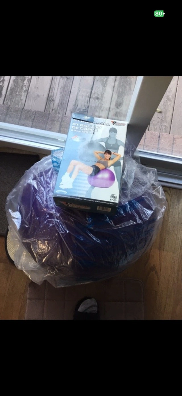 Get ready to bounce into shape with this 65cm (25.5") purple exercise ball and accompanying DVD! This exercise ball is in used condition. Perfect for core workouts, yoga, or just a fun way to sit at your desk. It's been gently enjoyed and is ready for a new home.