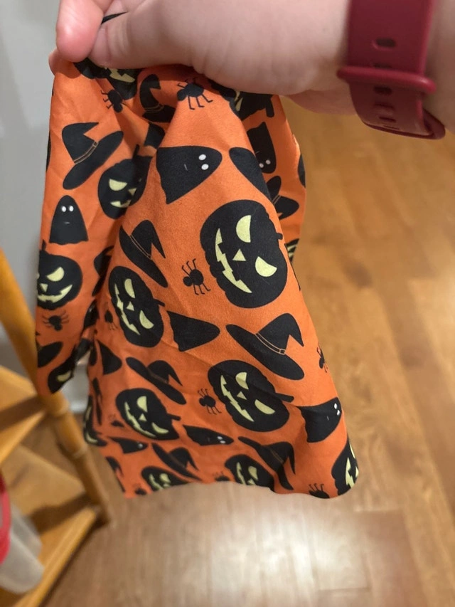Get your furry friend ready for Halloween with this festive dog bandanna, featuring a playful pattern of pumpkins, ghosts, witch hats and spiders on an orange background. This bandanna is in used condition, but still has plenty of life left to celebrate spooky season in style.