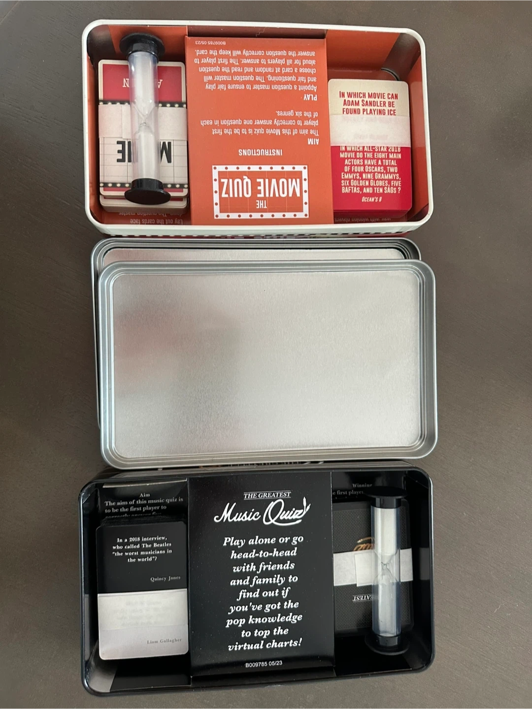 Each tin includes 200 questions and a sand timer