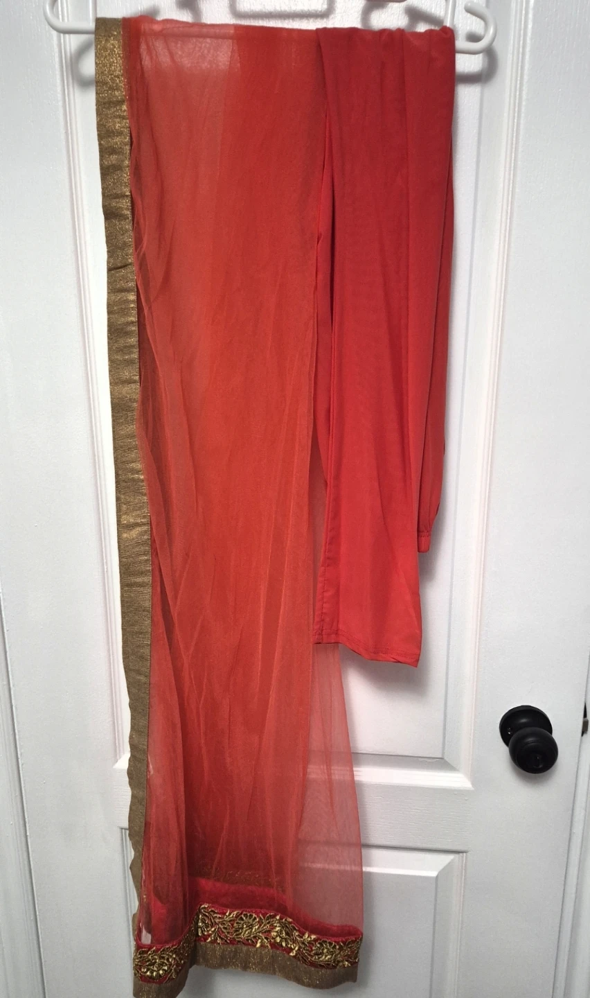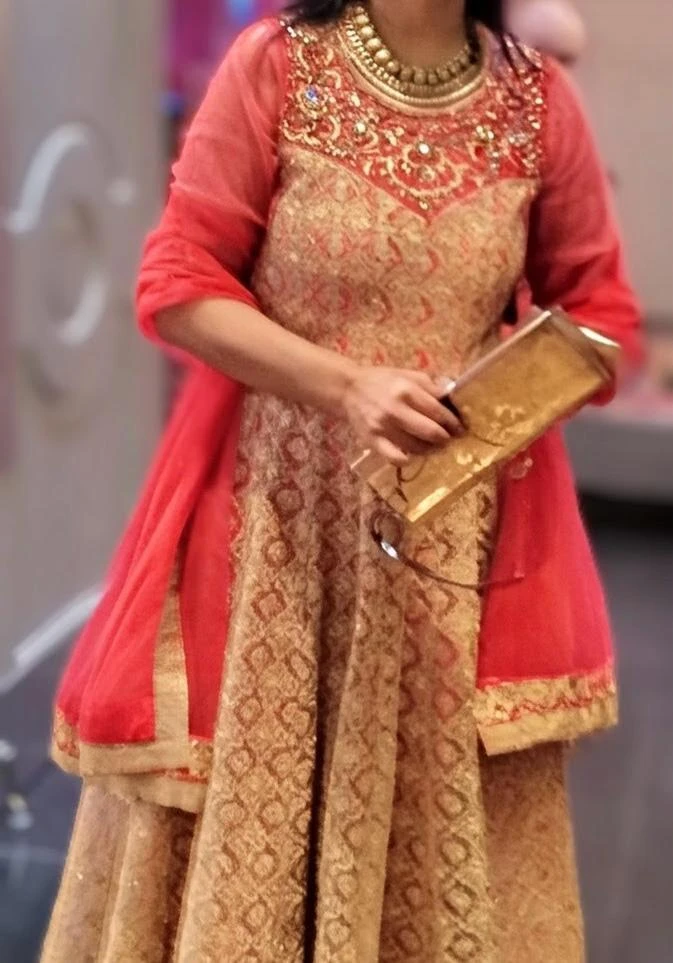 - Elegant coral-red and gold embroidered outfit, perfect for Eid, weddings, and special occasions. Features a beautifully detailed bodice with intricate gold embroidery and a flowy, flattering skirt.