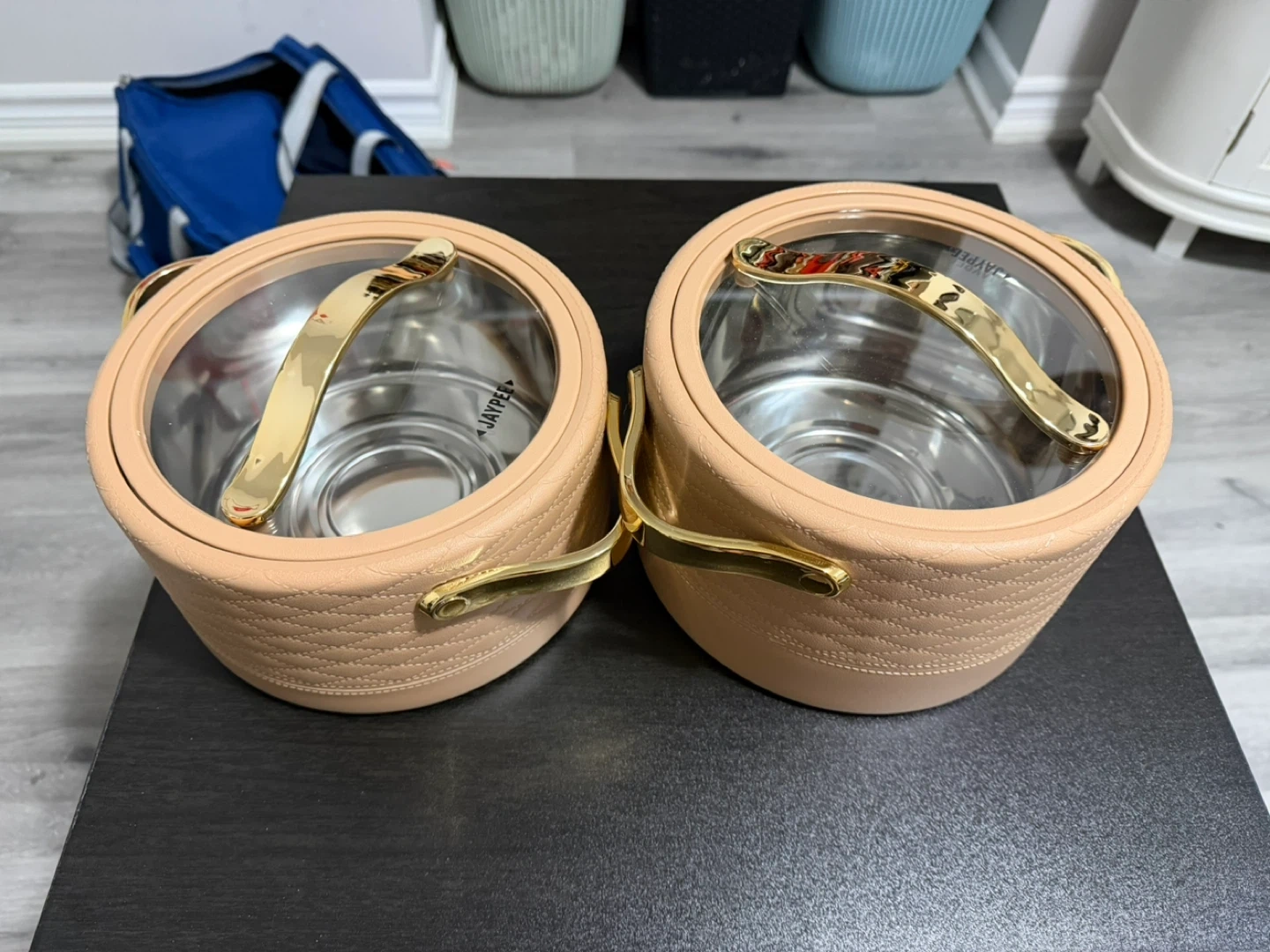 Selling a set of never used two Jaypee insulated casseroles. They're in excellent condition and ready to keep your food warm! The exterior has a quilted texture and gold-tone accents, adding a touch of elegance to your kitchen or buffet table. Perfect for keeping dishes at the right temperature during gatherings or everyday meals