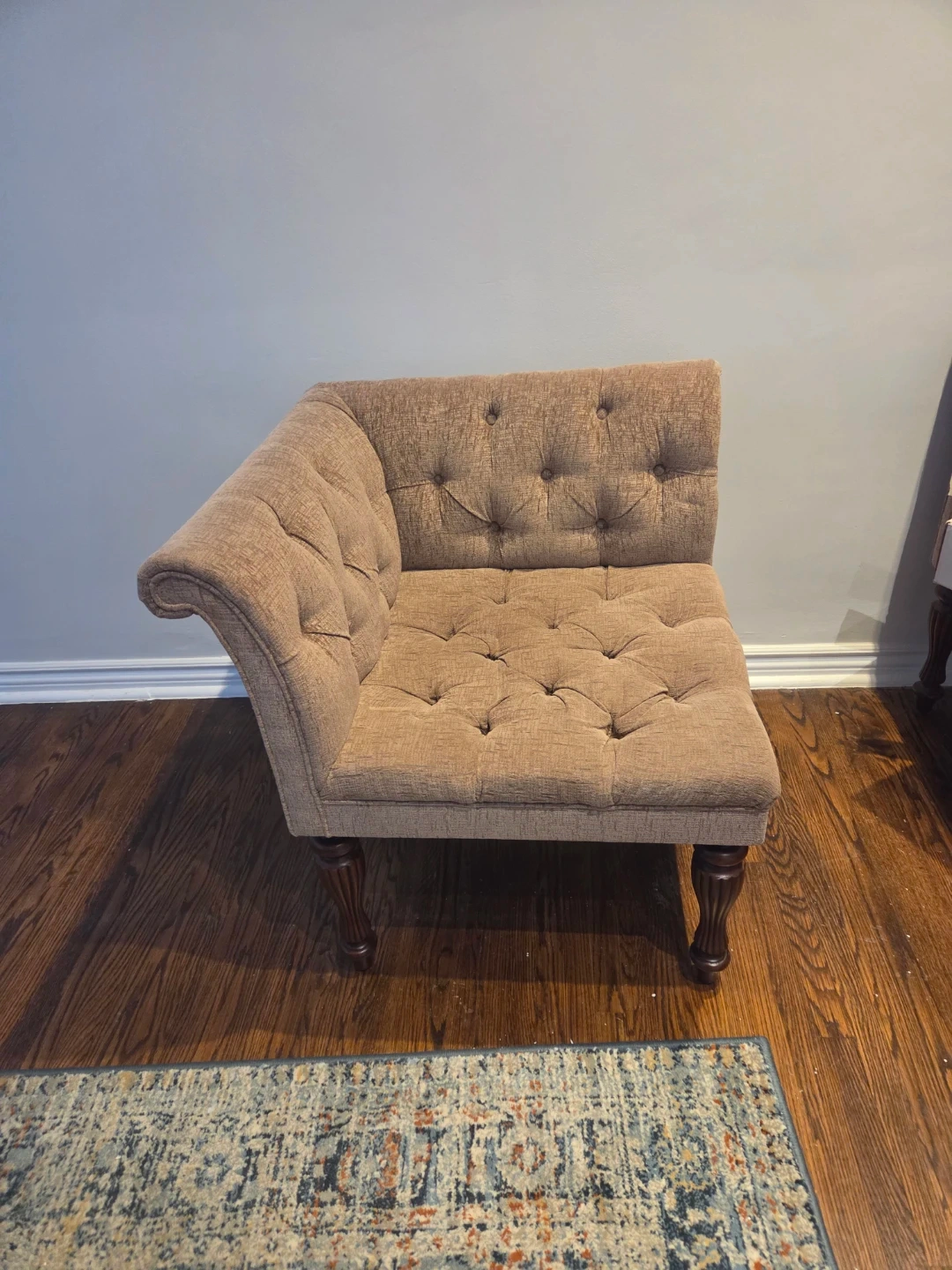 Selling two cozy armless accent chair! It features a tufted design and a neutral colour that would fit well in any living space. The chair is in good condition and ready to add a touch of elegance to your home