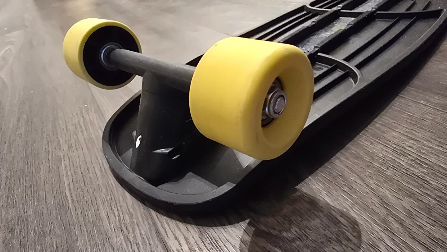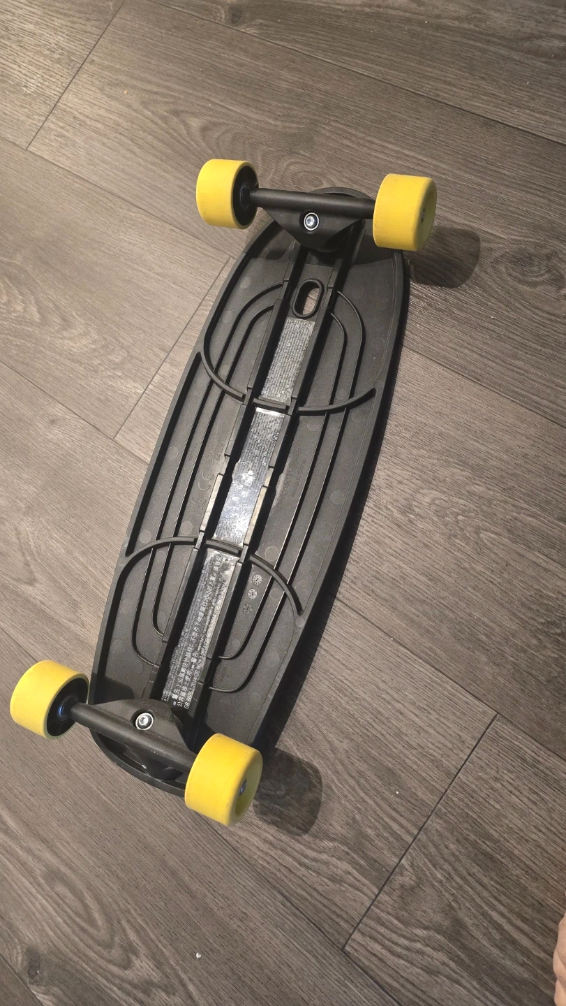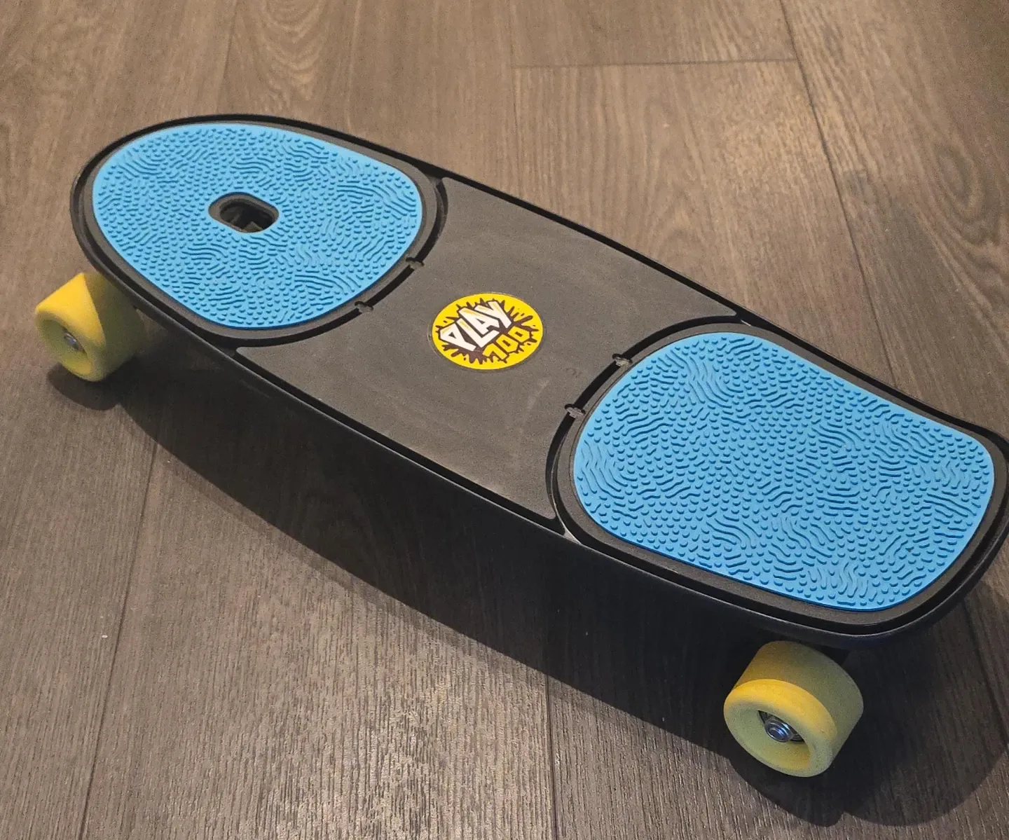 Selling a Play 100 skateboard! It's in great condition and ready for some fun. The skateboard features a black deck with textured blue pads and bright yellow wheels. Perfect for cruising around the neighbourhood!