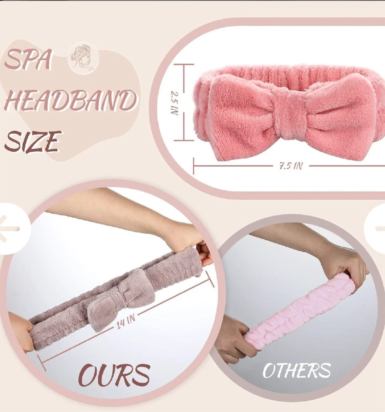 4 pack spa headband set, still in its original packaging! The set includes a variety of colours, perfect for keeping your hair back during your skincare routine or while applying makeup. Each headband is soft and comfortable, with a cute bow detail. The headbands are approximately 2.5 inches wide and 7.5 inches long, and very stretchy as you see in the pic!