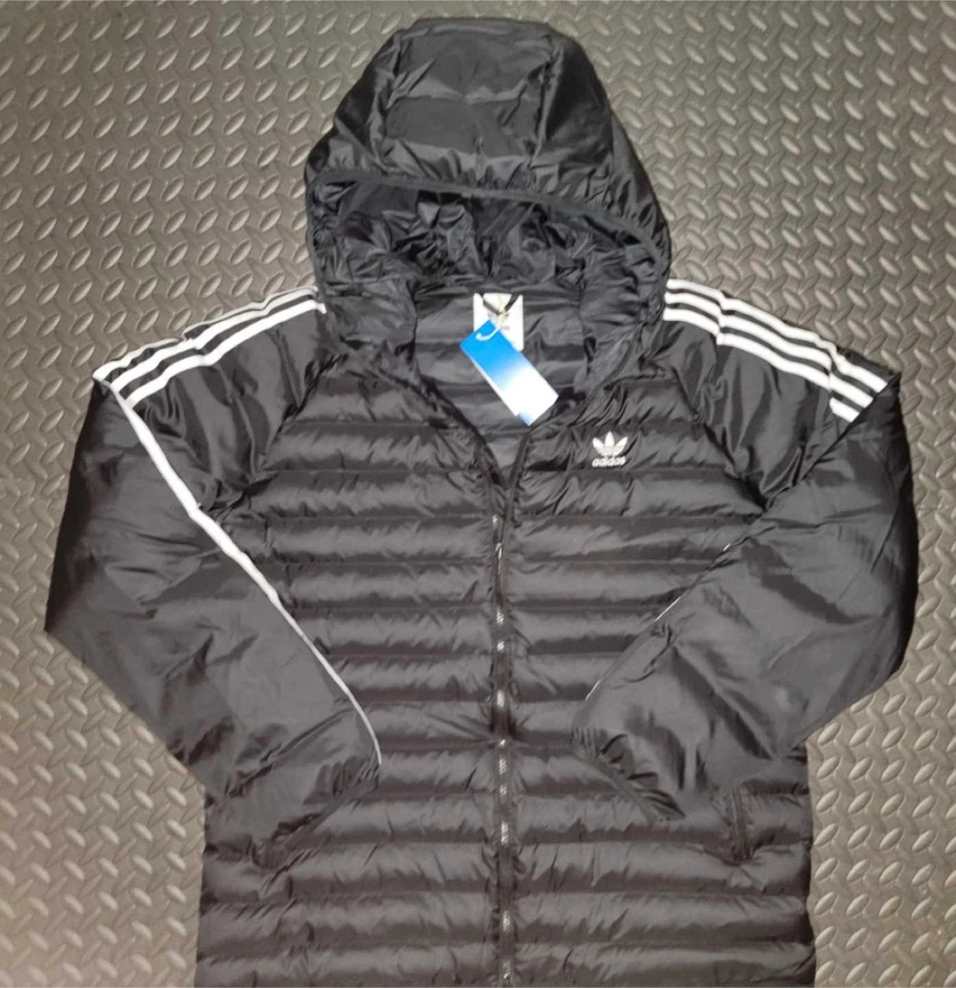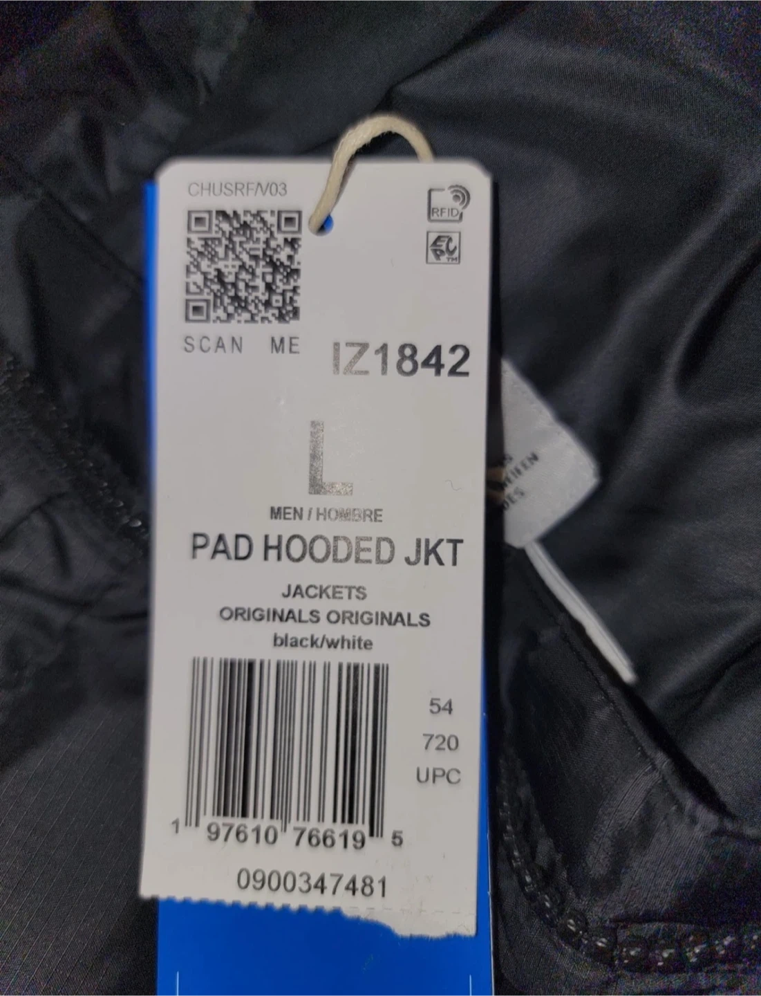 Selling an Adidas Originals Pad Hooded Jacket in black and white. It's a size L. This jacket is perfect for staying warm and stylish!