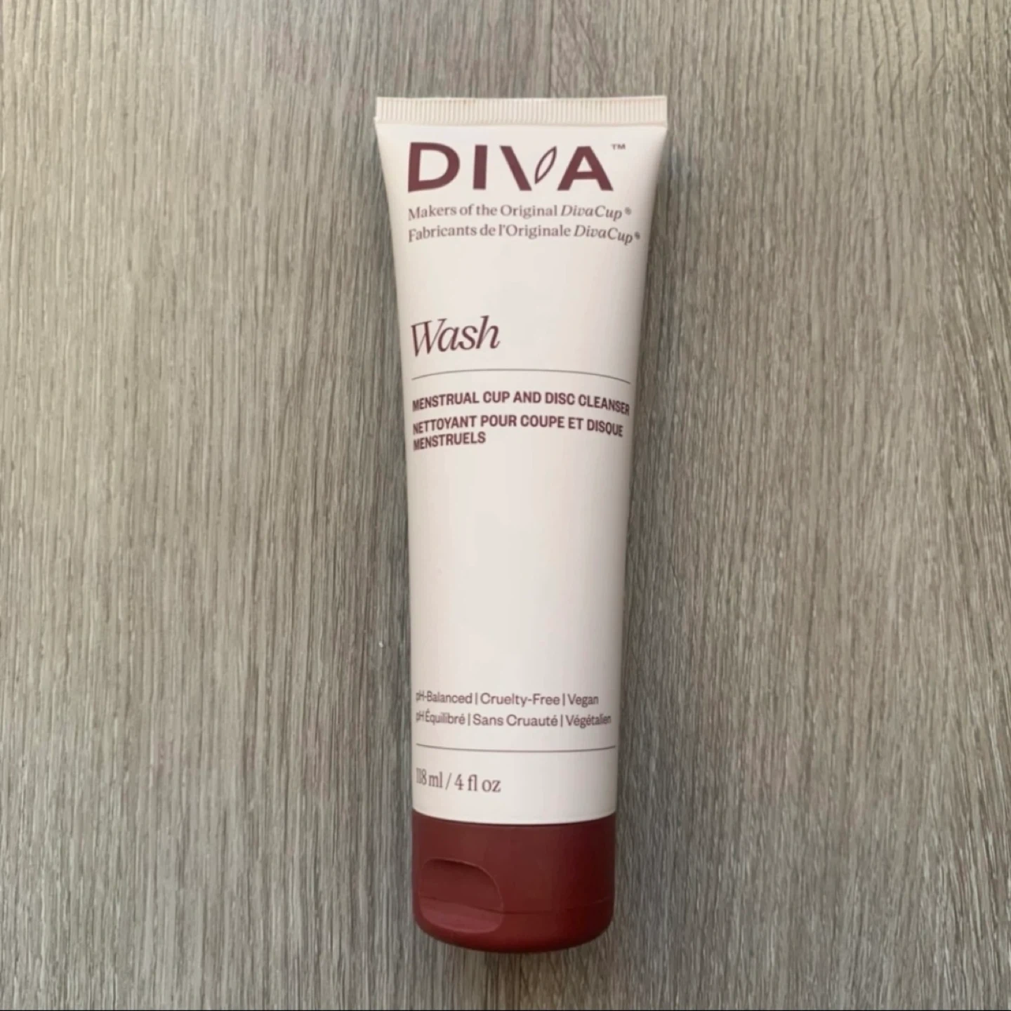 Selling a bottle of DIVA Wash Menstrual Cup and Disc Cleanser. It's a balanced, cruelty-free, and vegan cleanser. The bottle contains 118 mL / 4 fl oz