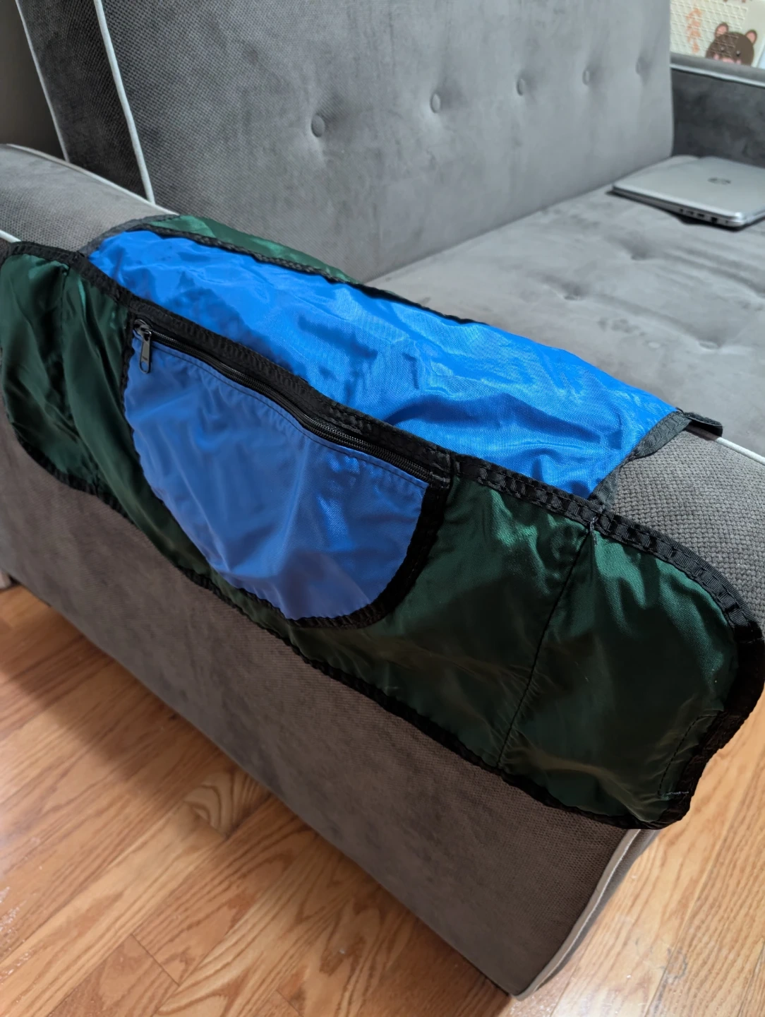 Selling a green and blue armrest organizer. It's in great condition and ready to use! It's perfect for storing your remotes, glasses and other things around your TV area.