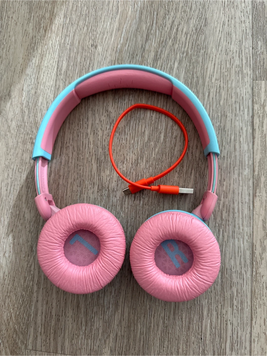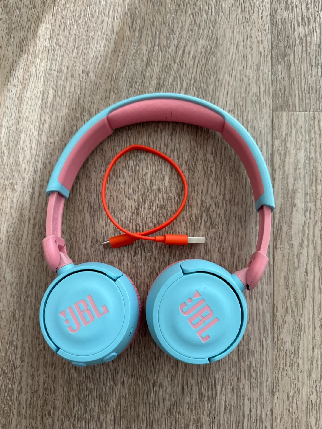 Two pairs of JBL JR310BT wireless headphones for kids! One is blue and pink, and the other is red and blue. Both come with their charging cables. Perfect for young music lovers!