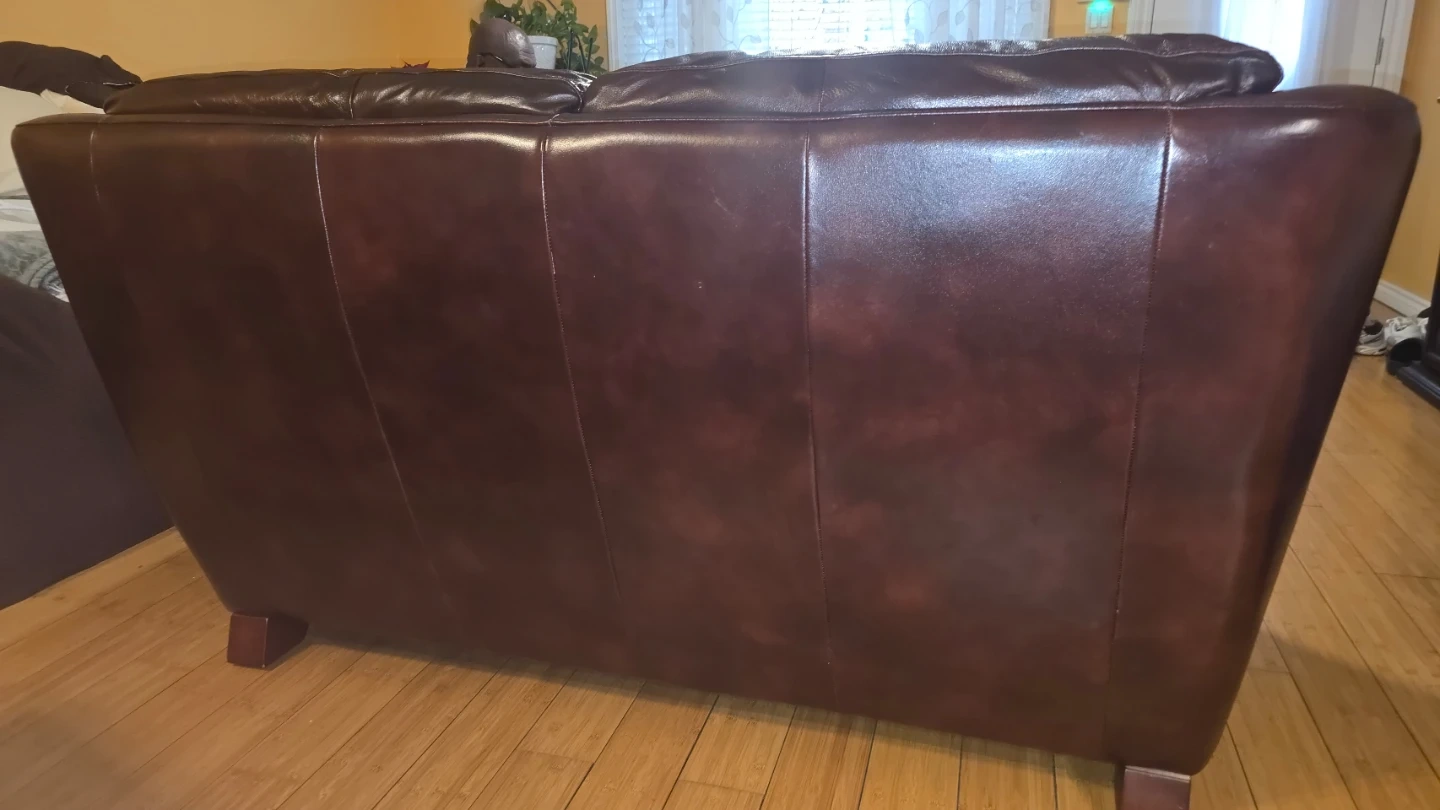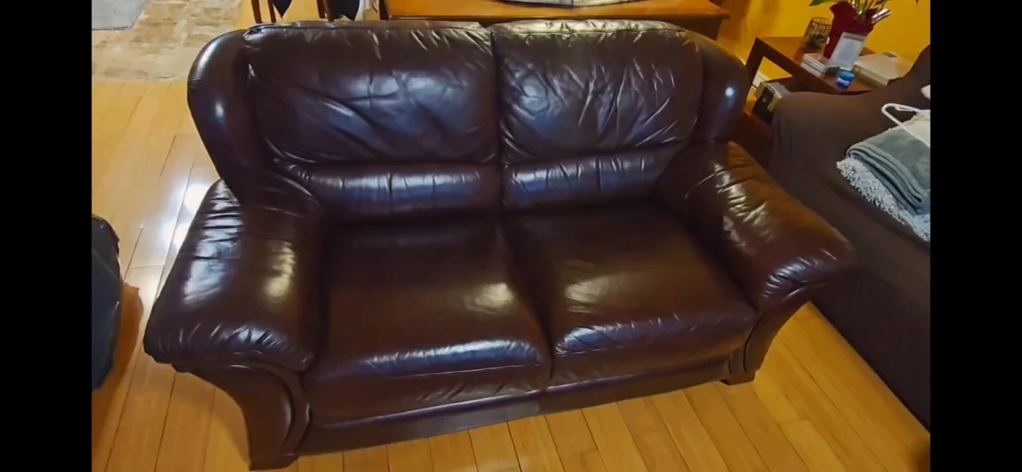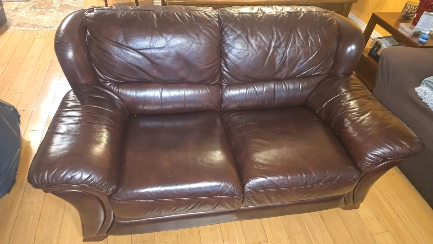 Here's a comfy brown leather loveseat! It's perfect for a smaller space or as an addition to your living room setup. The leather has a nice, worn-in look.