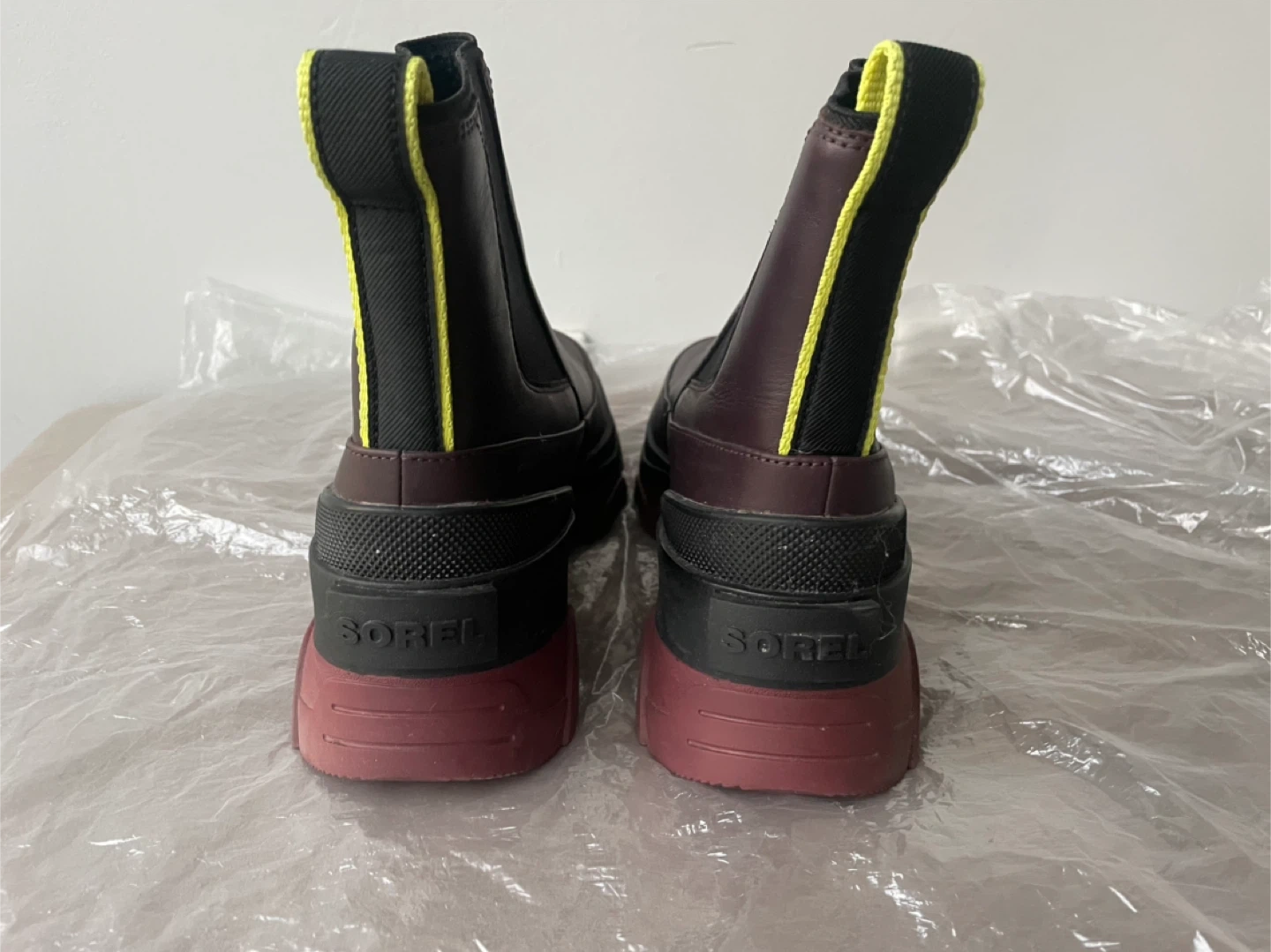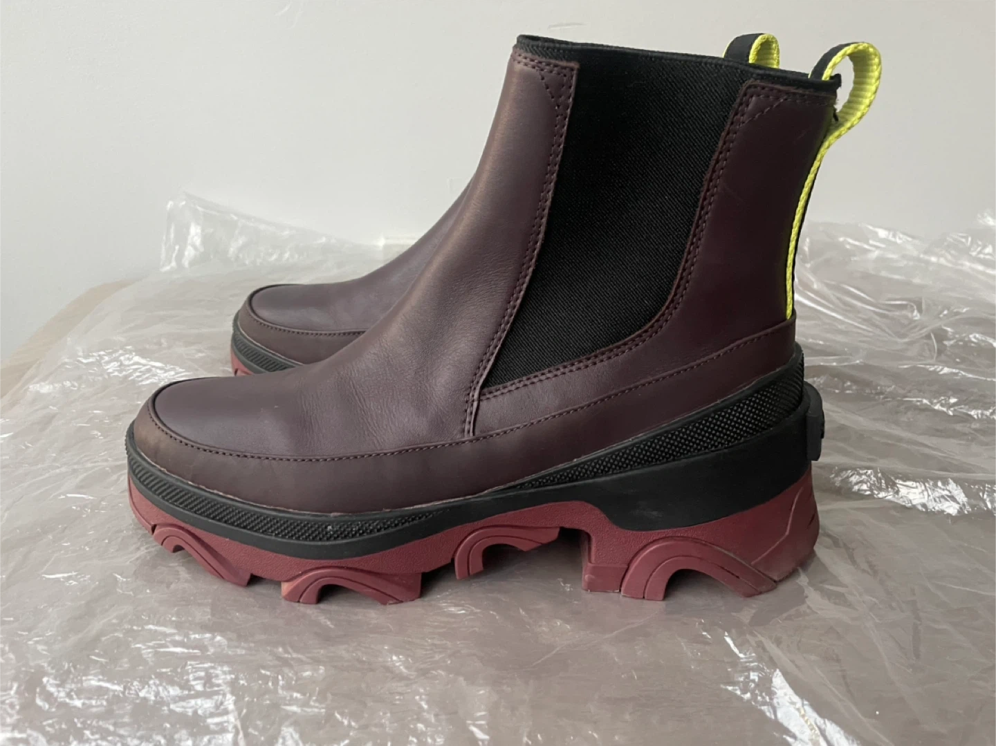 As new. Selling a pair of Sorel Women's Brex Chelsea Boots in size 7. These boots feature a stylish design with a burgundy leather upper, black elastic side panels, and a distinctive red and black lug sole.