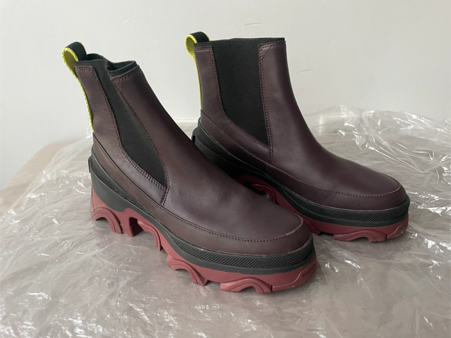 As new. Selling a pair of Sorel Women's Brex Chelsea Boots in size 7. These boots feature a stylish design with a burgundy leather upper, black elastic side panels, and a distinctive red and black lug sole.