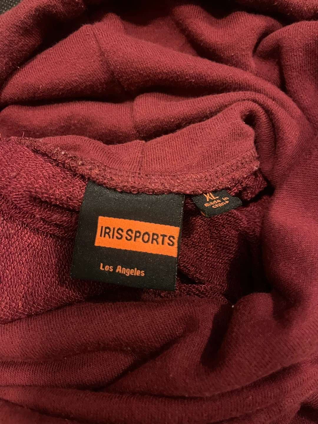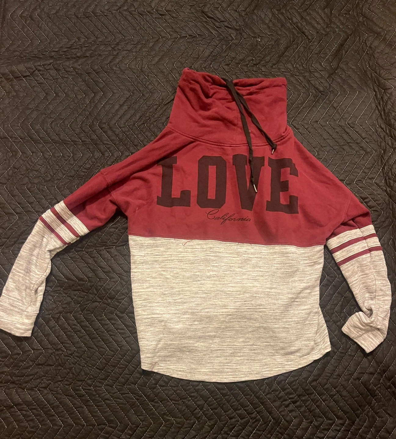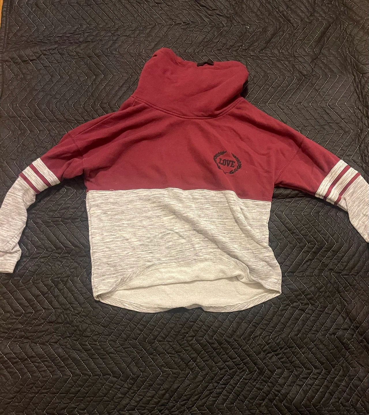 Cozy IRIS SPORTS hoodie with a unique design! It features a burgundy top with a high neckline and grey sleeves and lower body. The word "LOVE" is printed on the back. It's a size XL and in great condition!