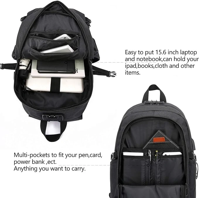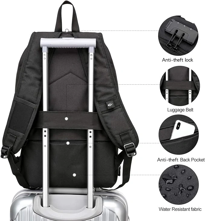 β SAFETY & PRACTICAL - This antitheft business travel computer bag With Fixed Password Lock and Durable Metal Zippers ,hidden anti-theft pocket on the back ,it is safe guaranteed for protecting your valuable items inside. No need to worry theft easily opening your backpack when you are travelling or lining up.A LUGGAGE STRAP allows backpack fit on luggage/suitcase, slide over the luggage upright handle tube for easier carrying.