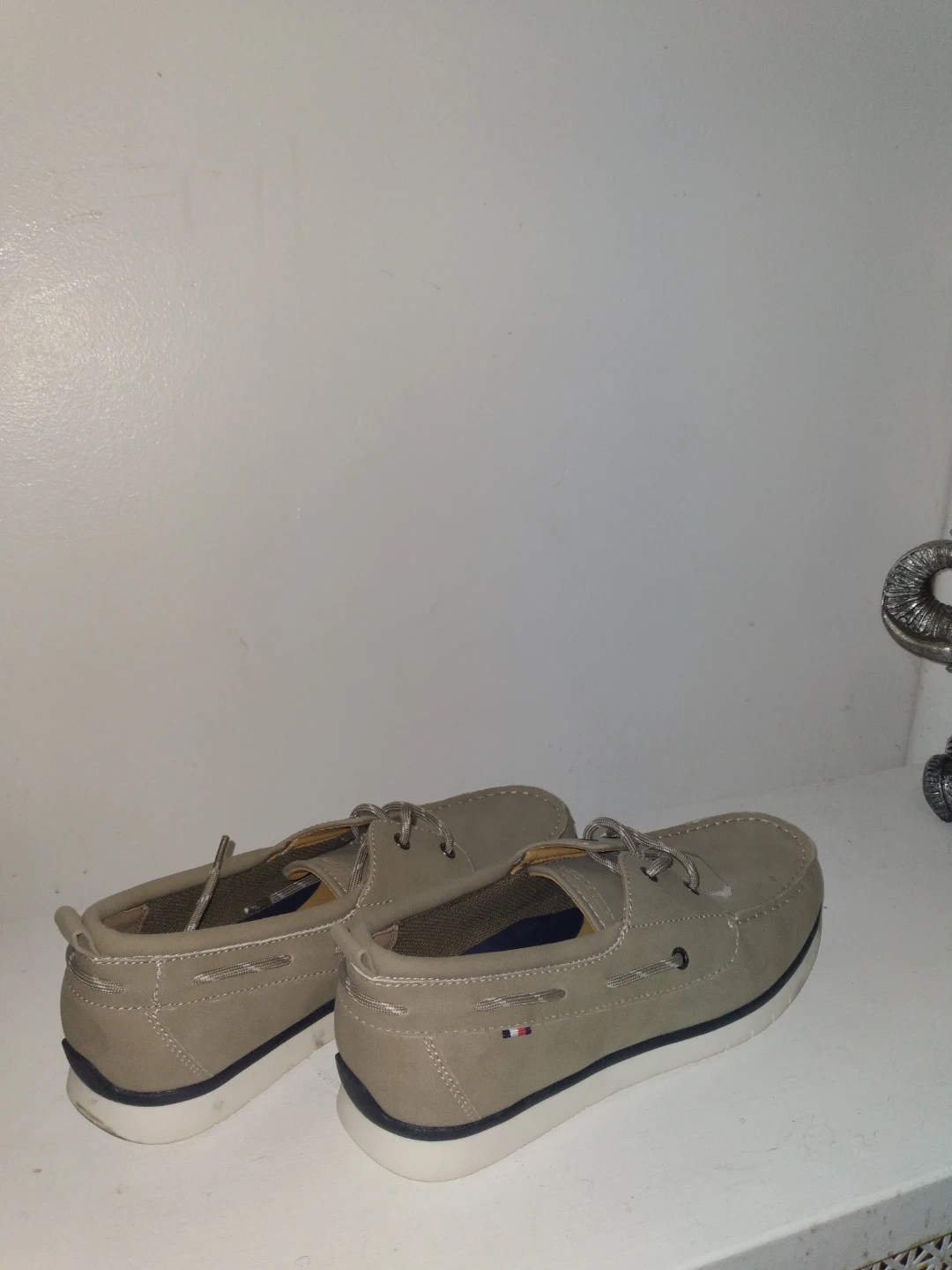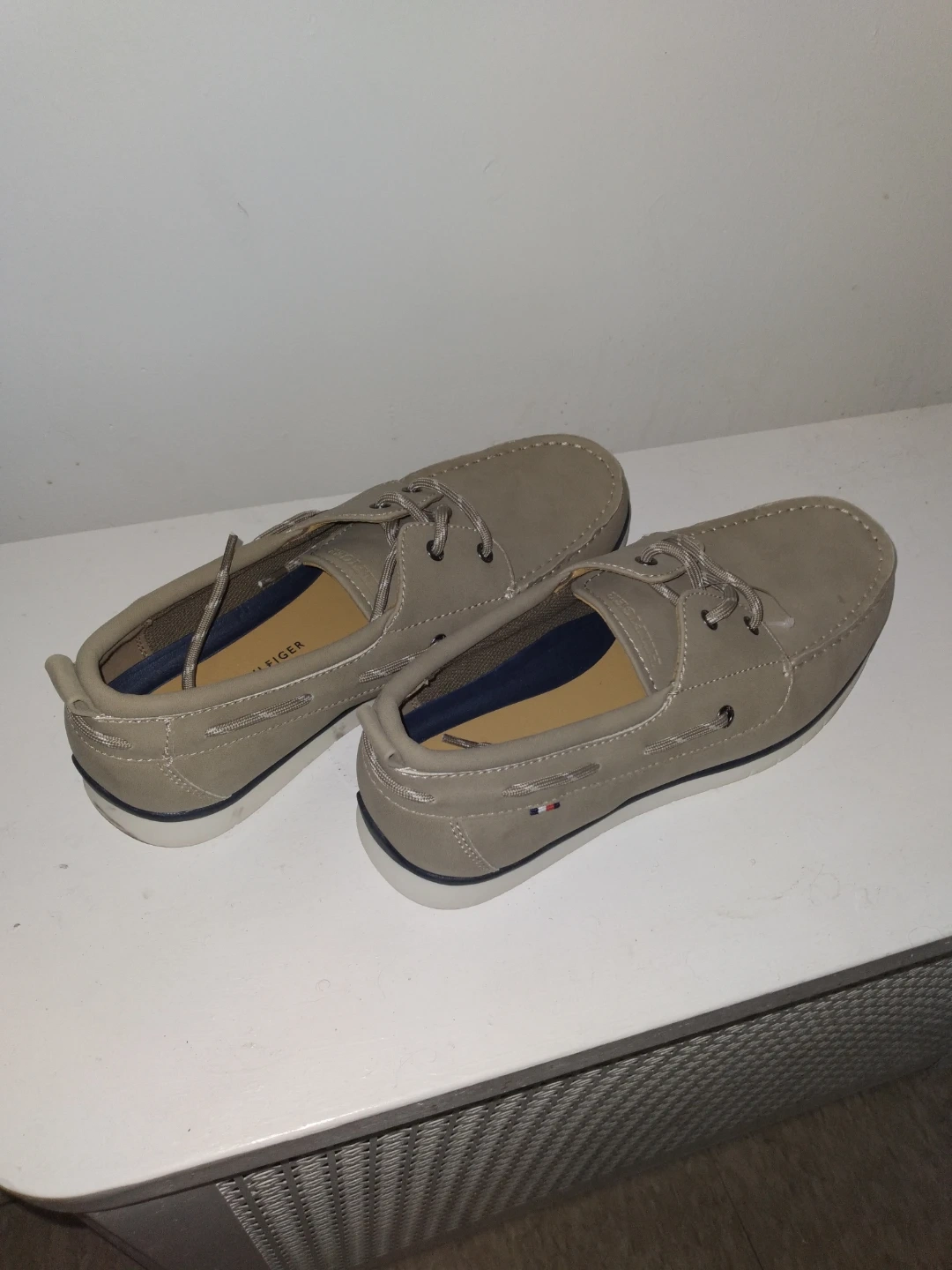 Selling a pair of Tommy Hilfiger boat shoes! They are a light beige color. There are laces, and the size is unknown. They are in good condition!