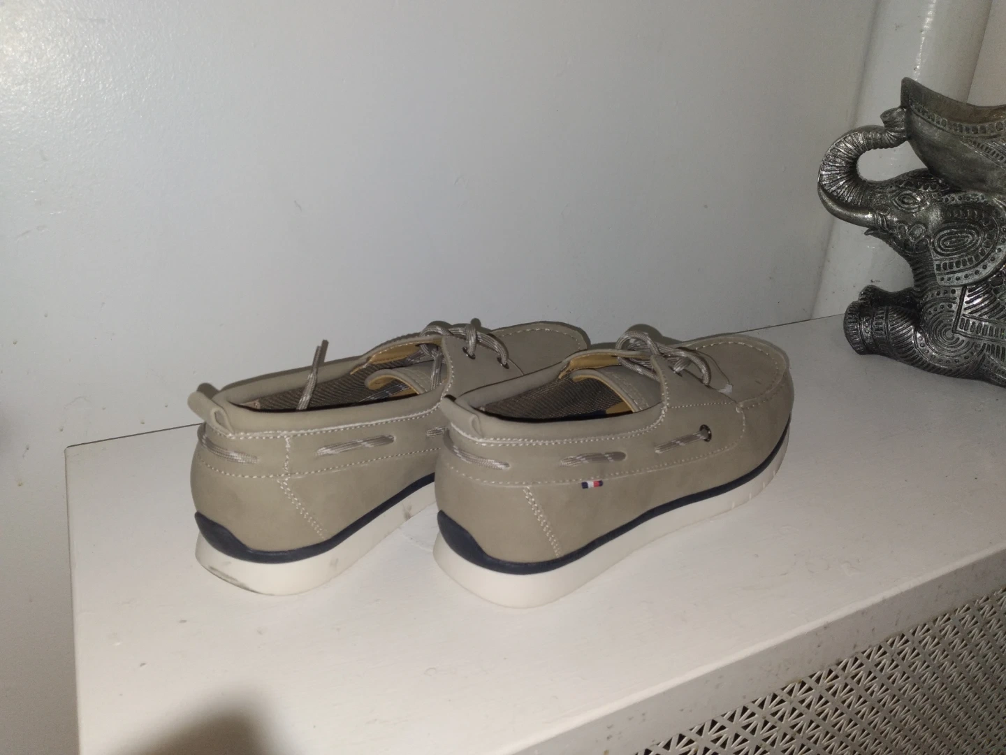 Selling a pair of Tommy Hilfiger boat shoes! They are a light beige color. There are laces, and the size is unknown. They are in good condition!