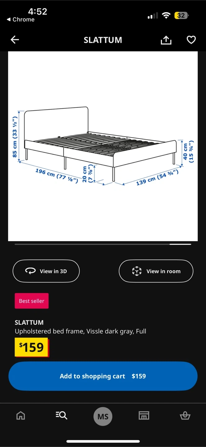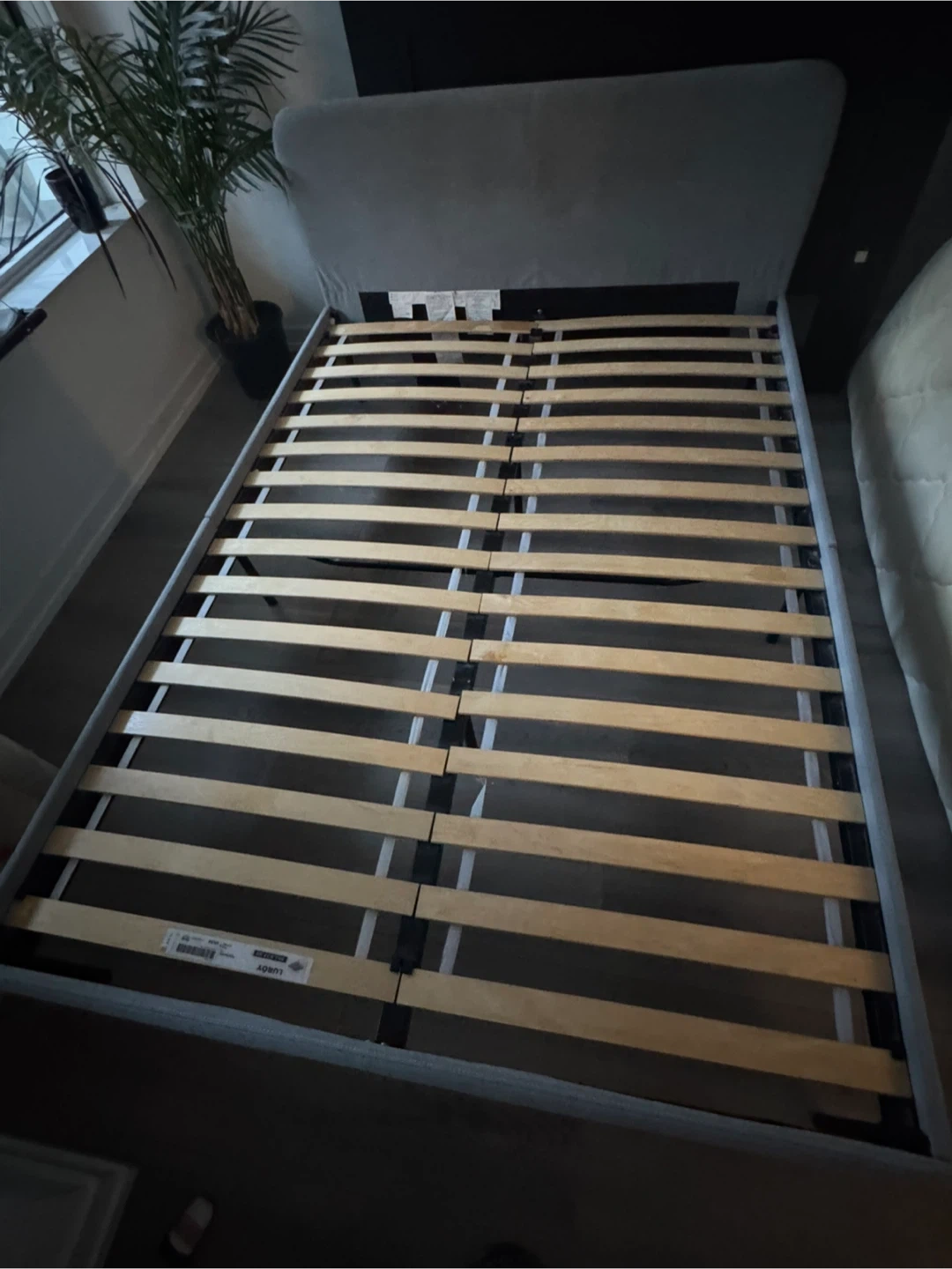 Selling a used IKEA SLATTUM upholstered bed frame in light gray. It's a full-size bed frame. Dimensions are 196cm (77 1/8") length and 139cm (54 3/4") width. Originally bought for $159. Less than 2 years ago. Good condition - minor scratching on bottom left corner. Selling as I’m moving and have purchased a larger bed.