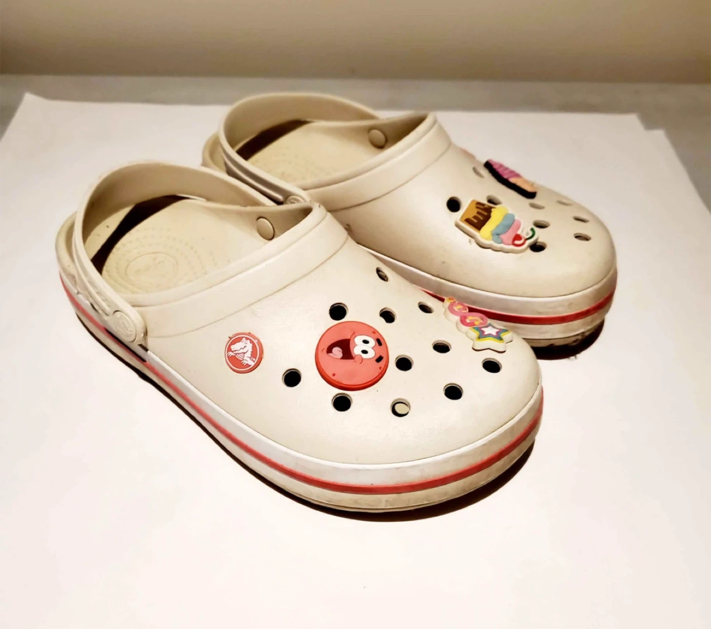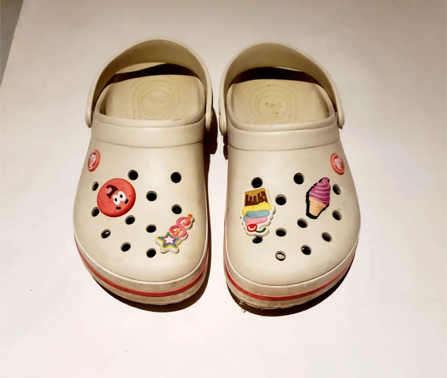 Selling a pair of Crocs clogs. They are a size 7 women or size 5 men and have some cute charms! They have a red stripe around the bottom. They are in good condition. Pins included