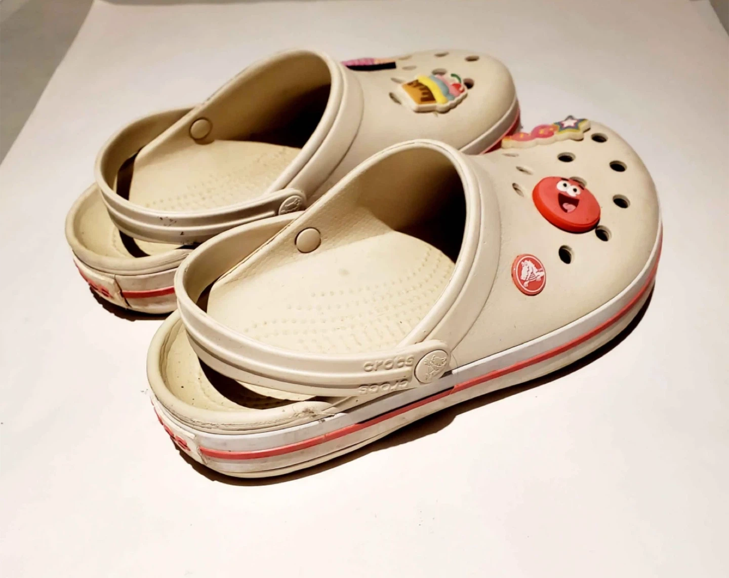 Selling a pair of Crocs clogs. They are a size 7 women or size 5 men and have some cute charms! They have a red stripe around the bottom. They are in good condition. Pins included