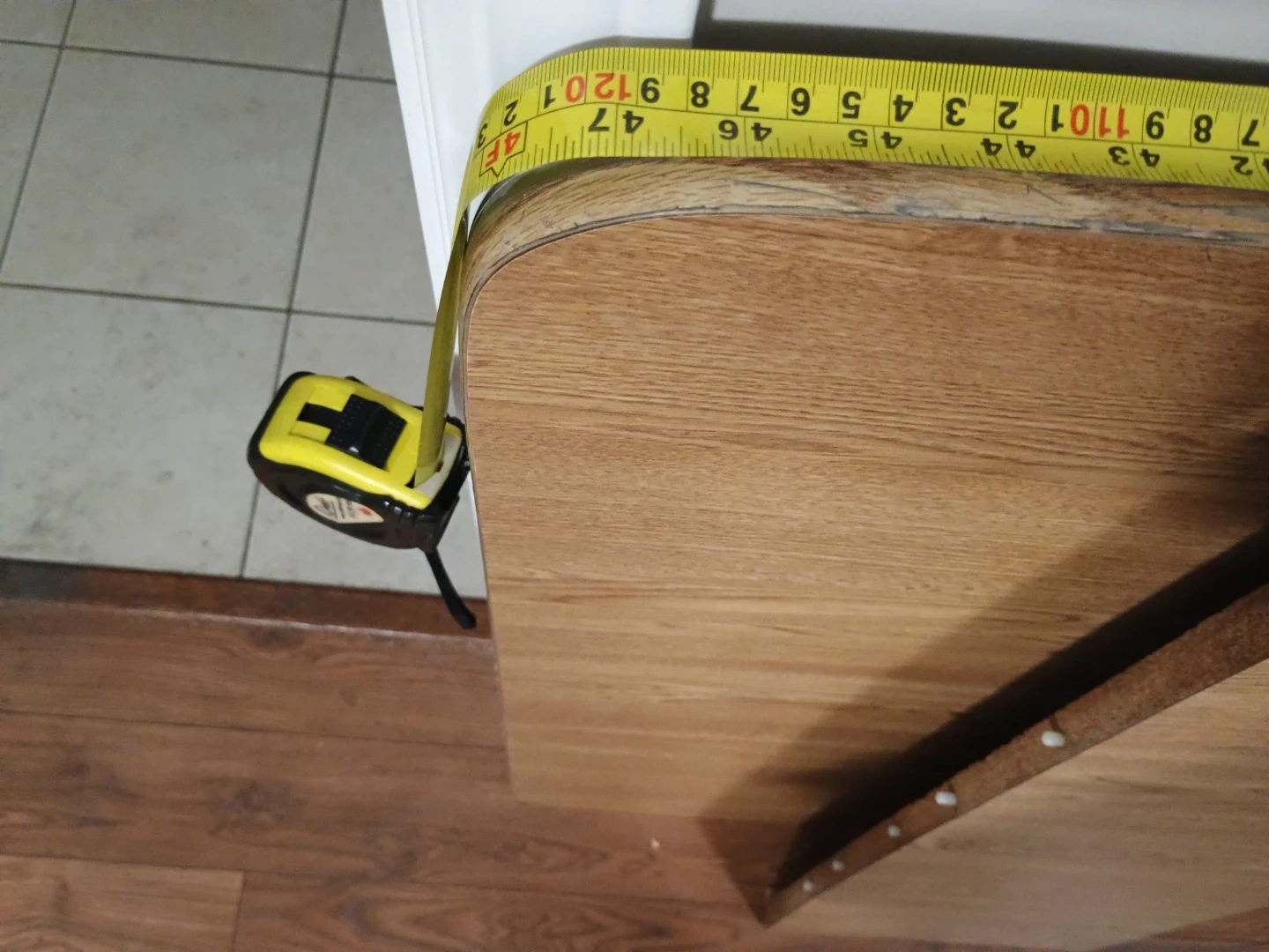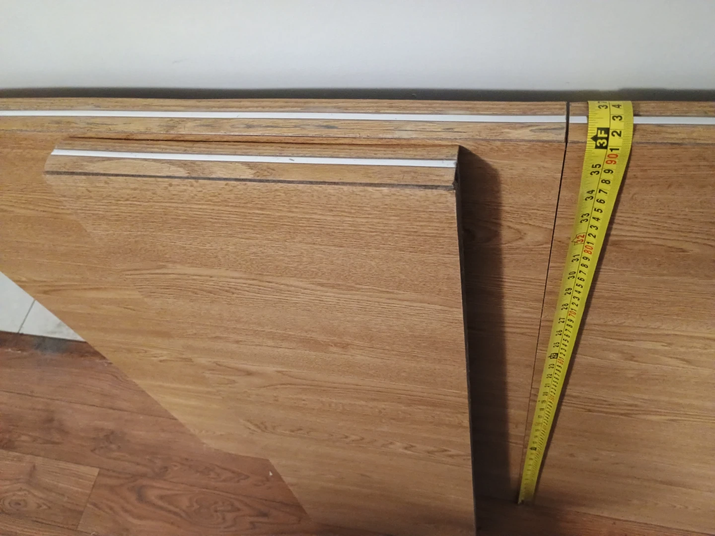 Selling a sturdy dining table with metal legs + extension. The tabletop has a wood grain finish and gold trim. The photos show the dimensions of the table. Great for a dining table or work table!