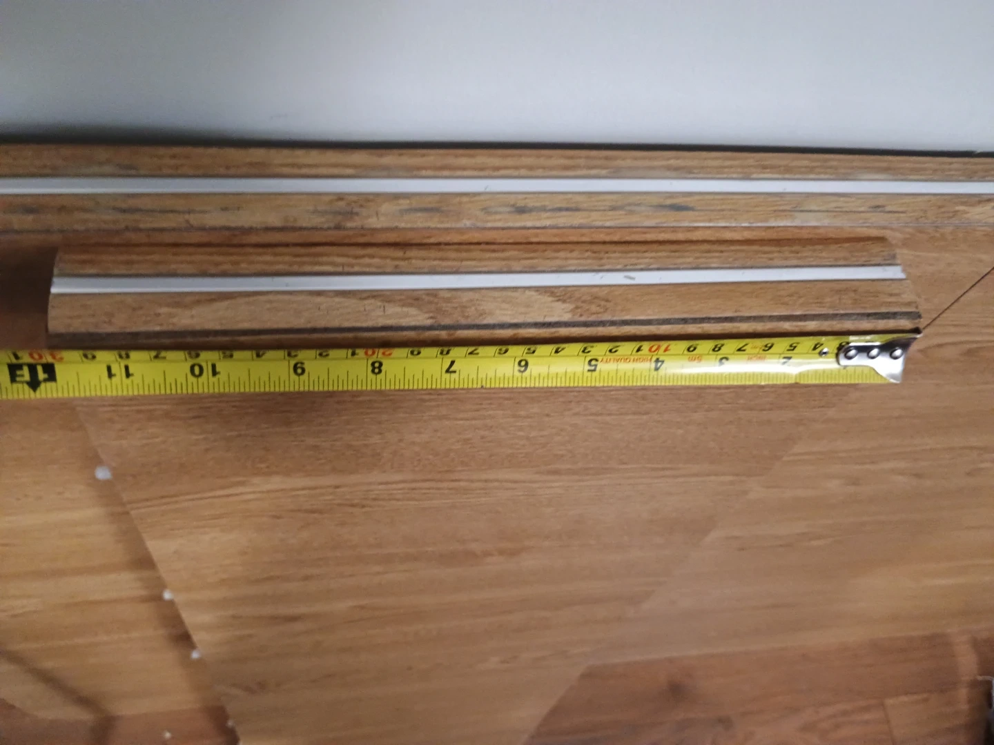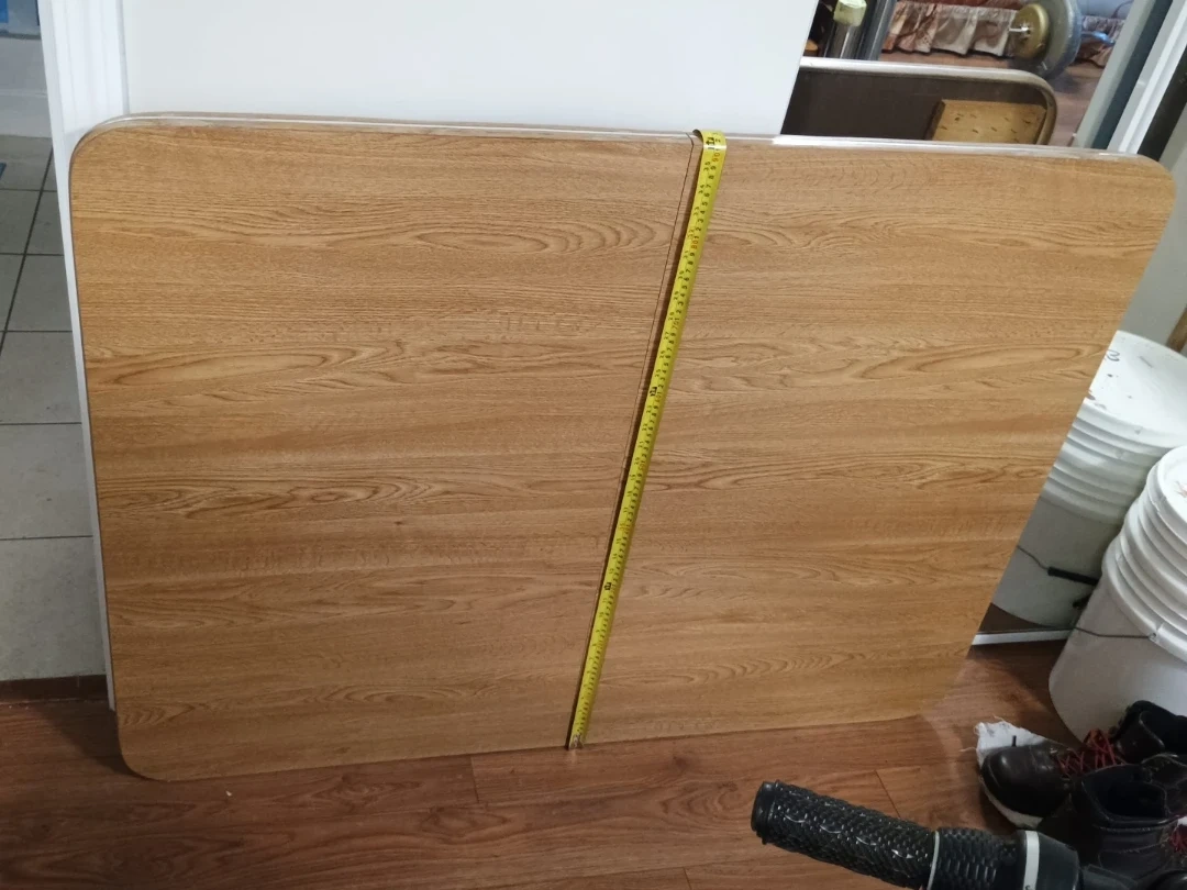 Selling a sturdy dining table with metal legs + extension. The tabletop has a wood grain finish and gold trim. The photos show the dimensions of the table. Great for a dining table or work table!