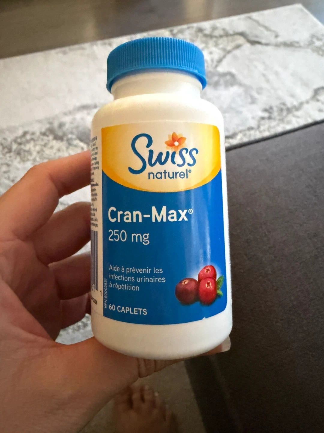 Selling a bottle of Swiss Natural Cran-Max 250mg caplets. It contains 60 caplets to help prevent urinary tract infections. A great supplement to have on hand!