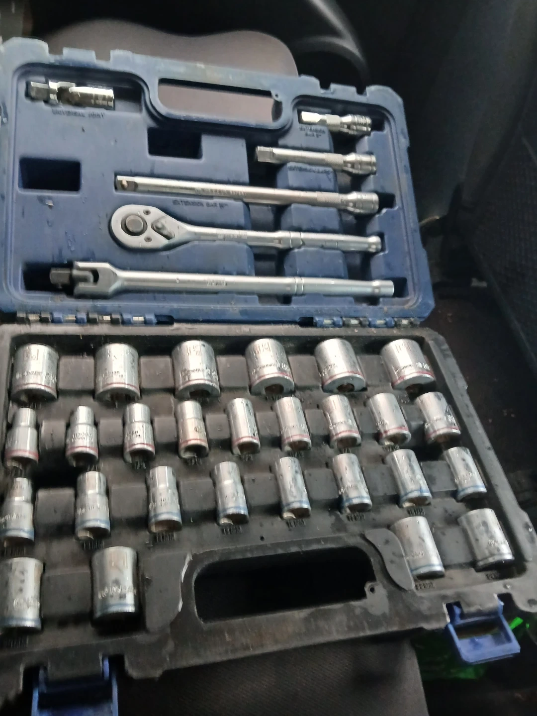 Selling a socket wrench set. It comes in a blue case with various socket sizes and wrench attachments. Great for any home or auto repair projects!