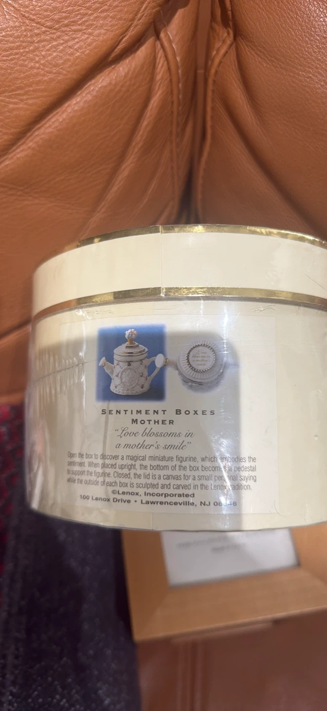 Selling a Lenox China Treasures Sentiment Box, perfect for a mother's sentiment. The box features a beautiful design with 'Love blossoms in a mother's smile'. Inside, you'll discover a magnetic miniature figurine, adding a special touch to this lovely keepsake