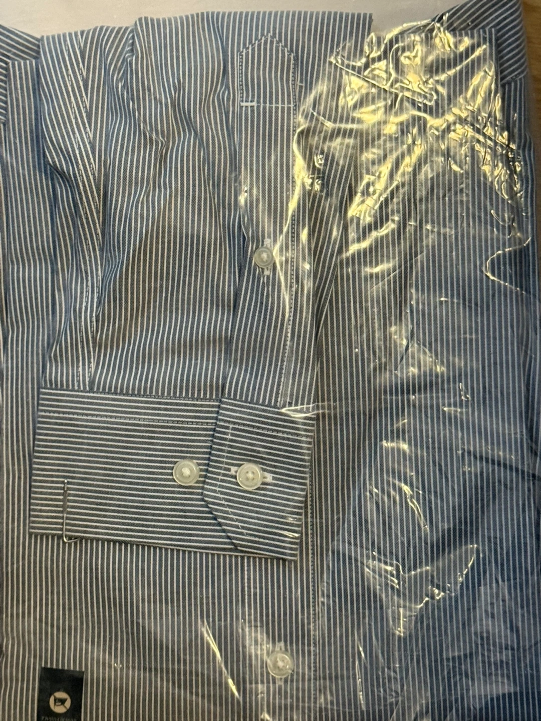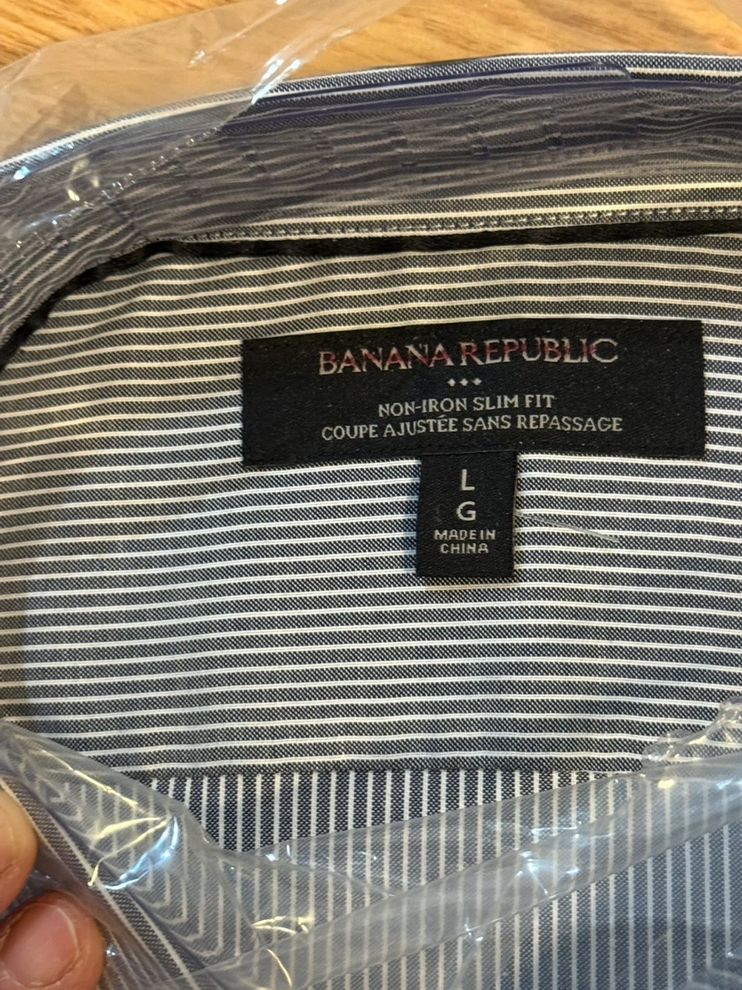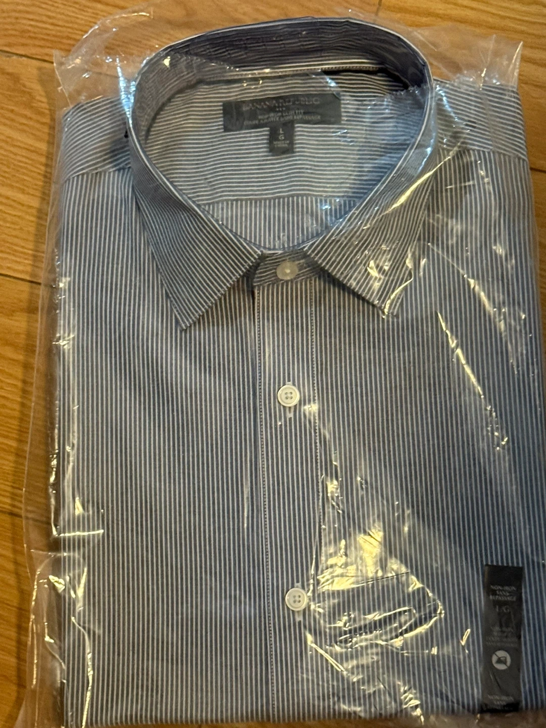 Selling a brand new Banana Republic Non-Iron Slim Fit long sleeve shirt, still in its original packaging! It's a size large with a stylish striped pattern. This shirt is perfect for a professional look without the hassle of ironing.