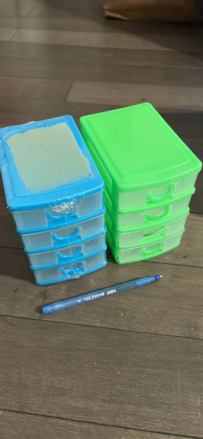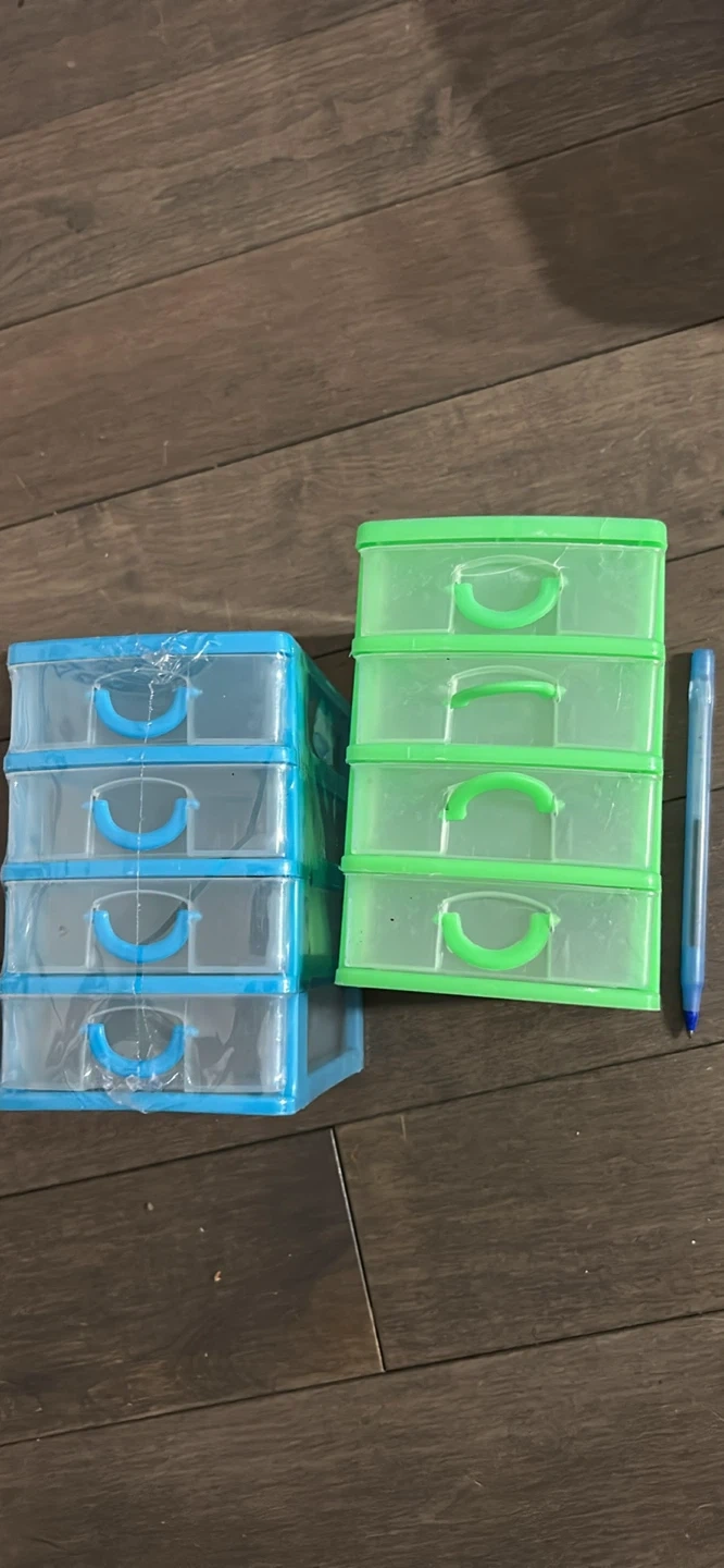 Selling a set of storage drawers! There are two sets of drawers, one in blue and one in green. Perfect for organizing small items around the house or office