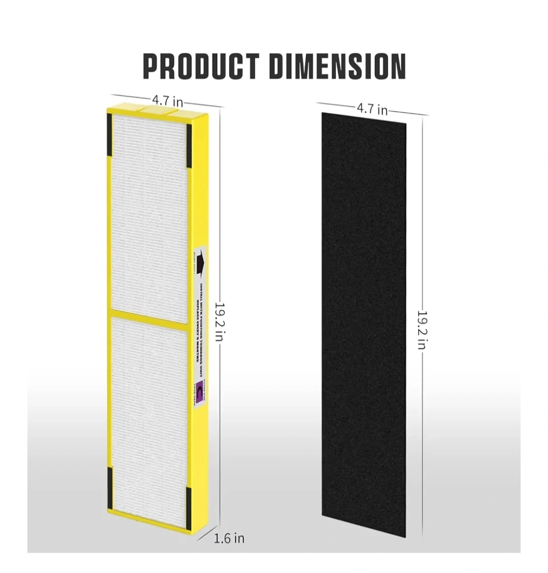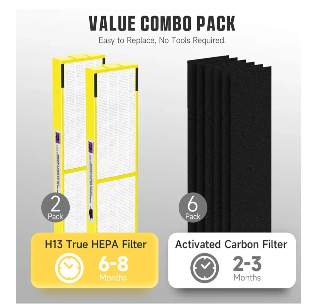 This is a value combo pack that includes two H13 True HEPA filters and six activated carbon filters. They are easy to replace and don't require any tools. The H13 True HEPA filters help filter up to 99.97% of airborne particles down to 0.3um, such as pollen, fine dust, pet dander. The activated carbon pre-filter gets rid of indoor odour, such as cooking smell, smoke and harmful VOCs