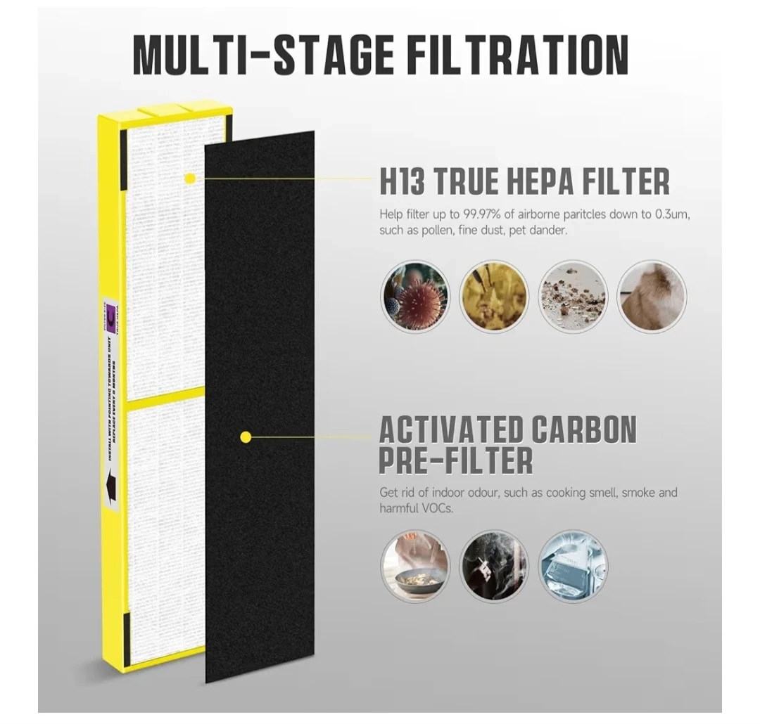 This is a value combo pack that includes two H13 True HEPA filters and six activated carbon filters. They are easy to replace and don't require any tools. The H13 True HEPA filters help filter up to 99.97% of airborne particles down to 0.3um, such as pollen, fine dust, pet dander. The activated carbon pre-filter gets rid of indoor odour, such as cooking smell, smoke and harmful VOCs