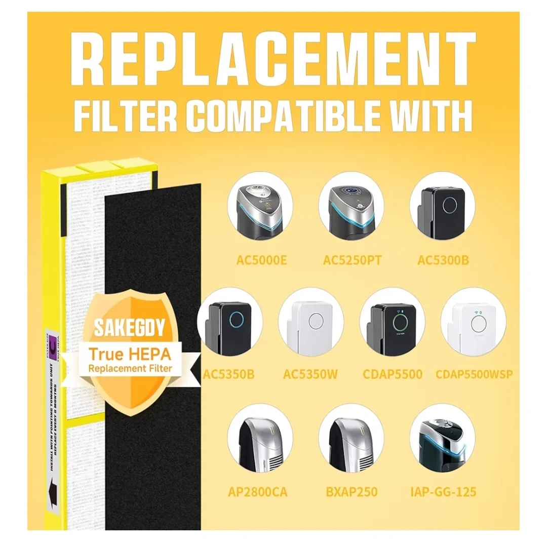 SAKEGDY 2 Pack FLT5000 HEPA Replacement Filter C and 6 Activated Carbon Pre-filters Compatible with Air Purifier Model AC5000 AC5000E AC5350B AC5250PT AC5300B AC5350W AP2800CA CDAP5500B